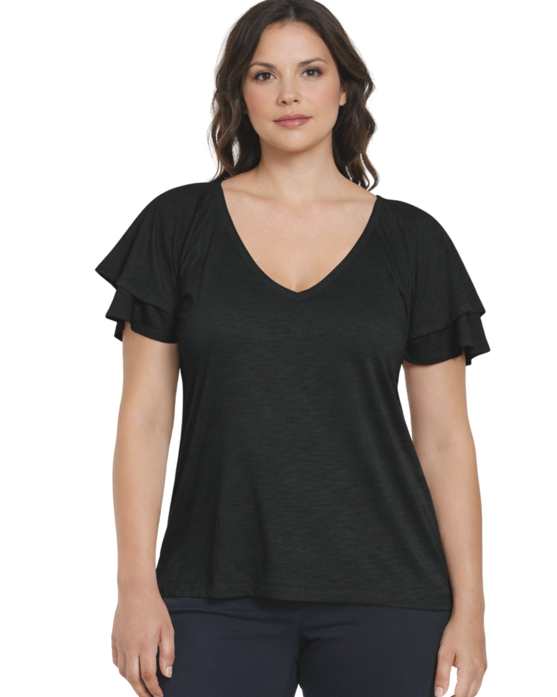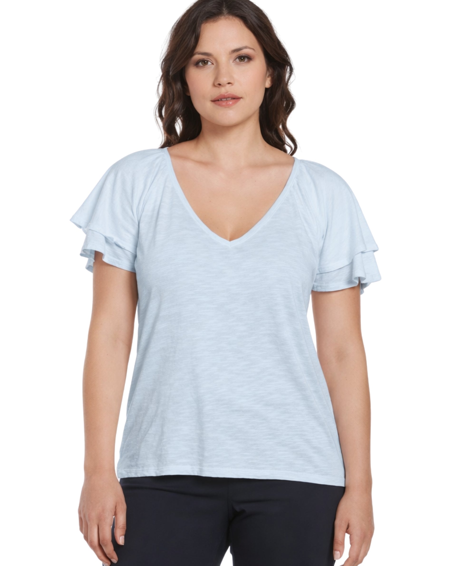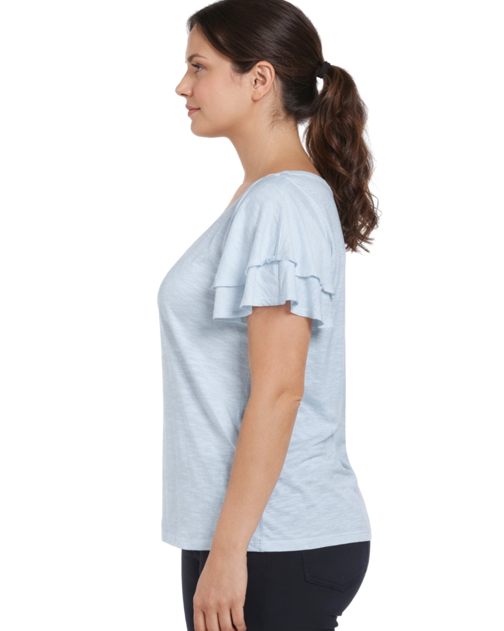 Ruffle Sleeve, V Neck, Casual, 60% Cotton, 40% Modal