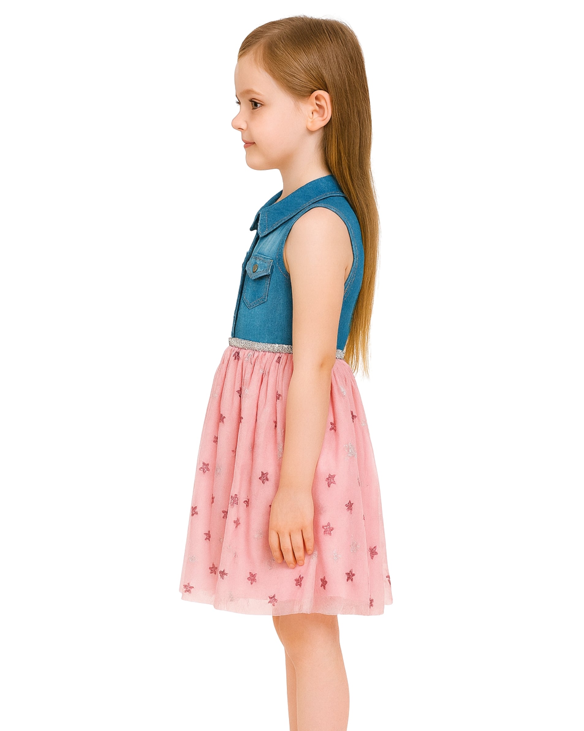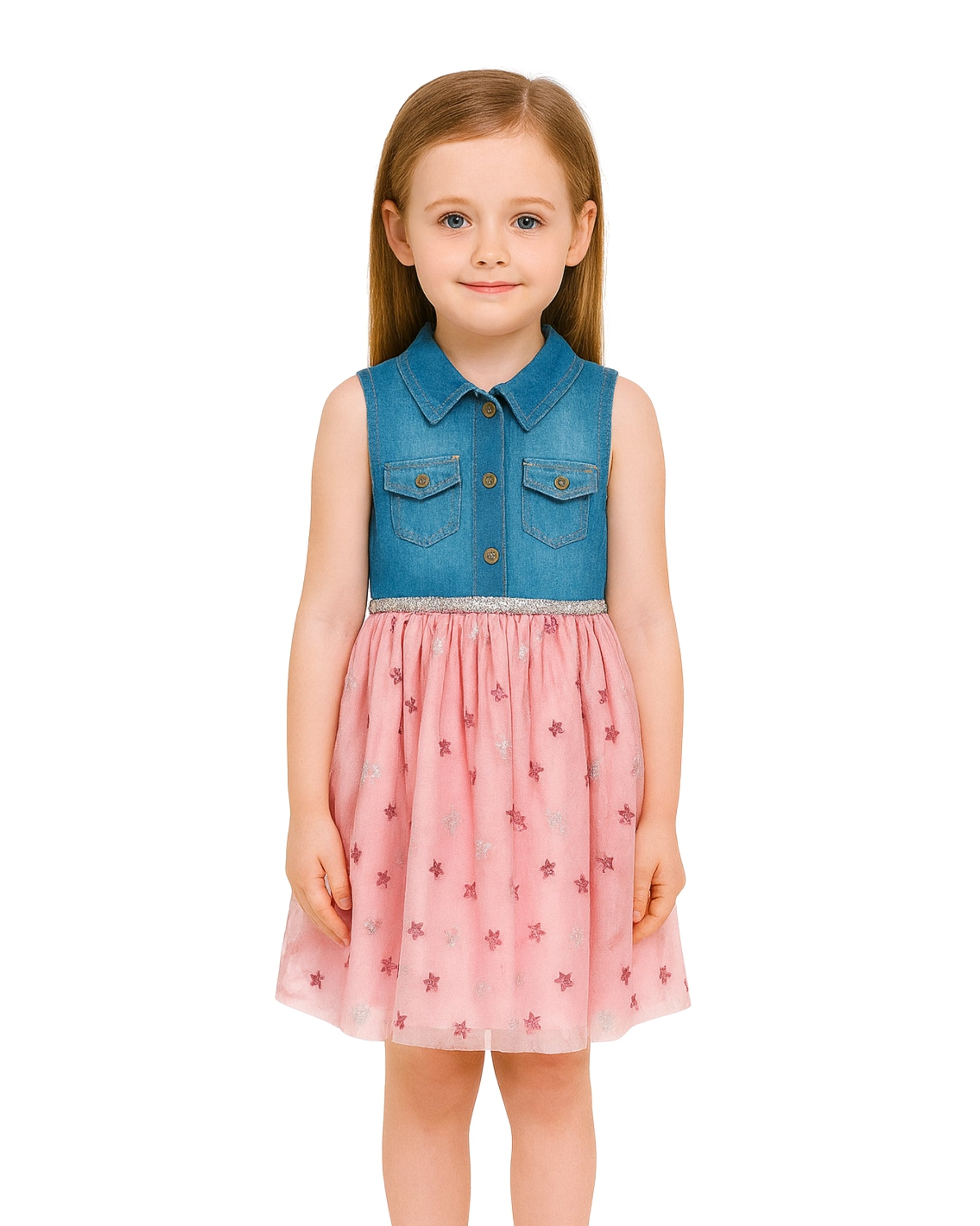 Button Closures At Front, Hits Above The knee, Point Collar, Pocket Details At Chest, Embellished Waistband, Glitter Star Print At Skirt Lined
