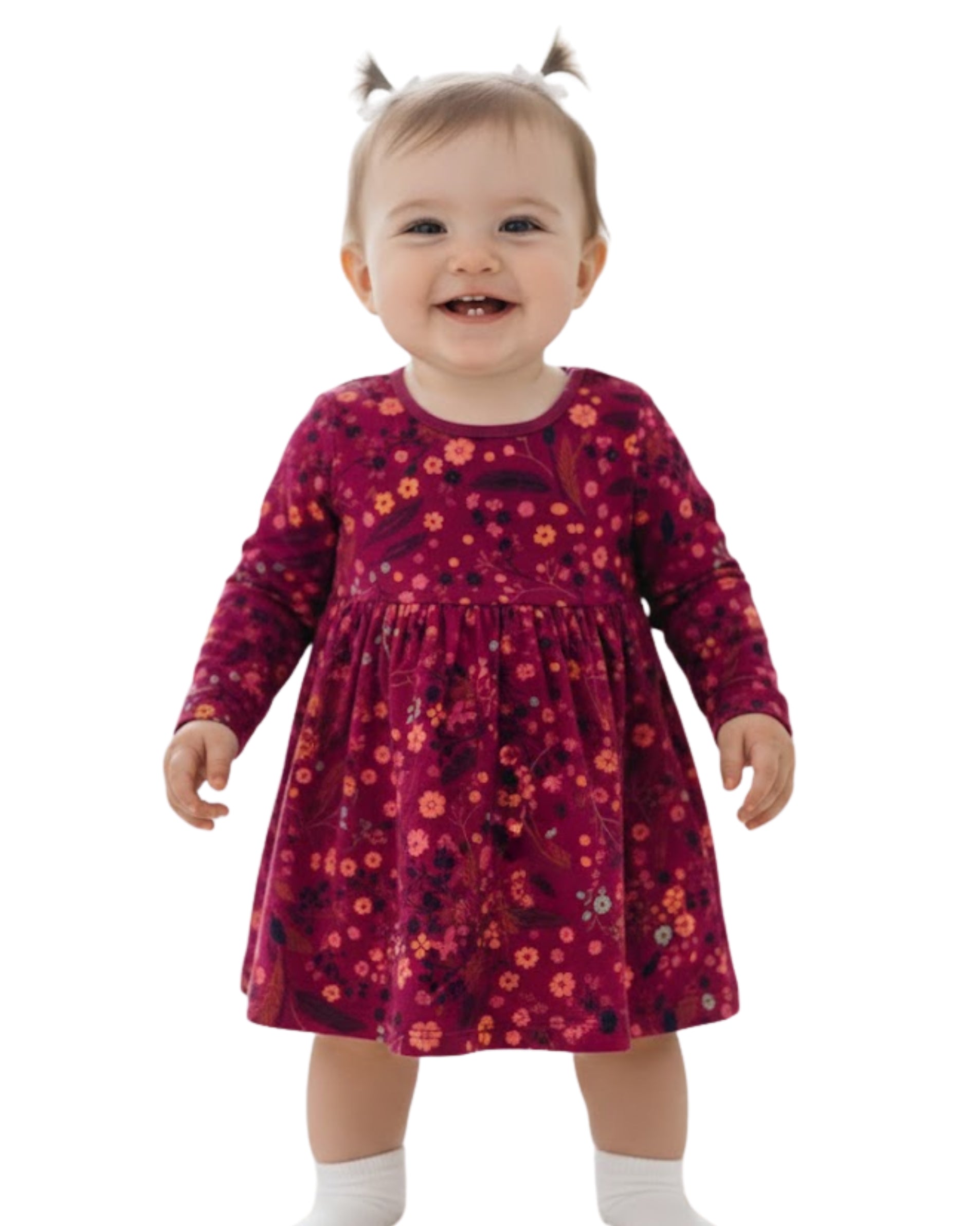 Baby Girls, Long Sleeve, Crew Neck, Floral, Ruffle, Casual Dress, 100% Cotton