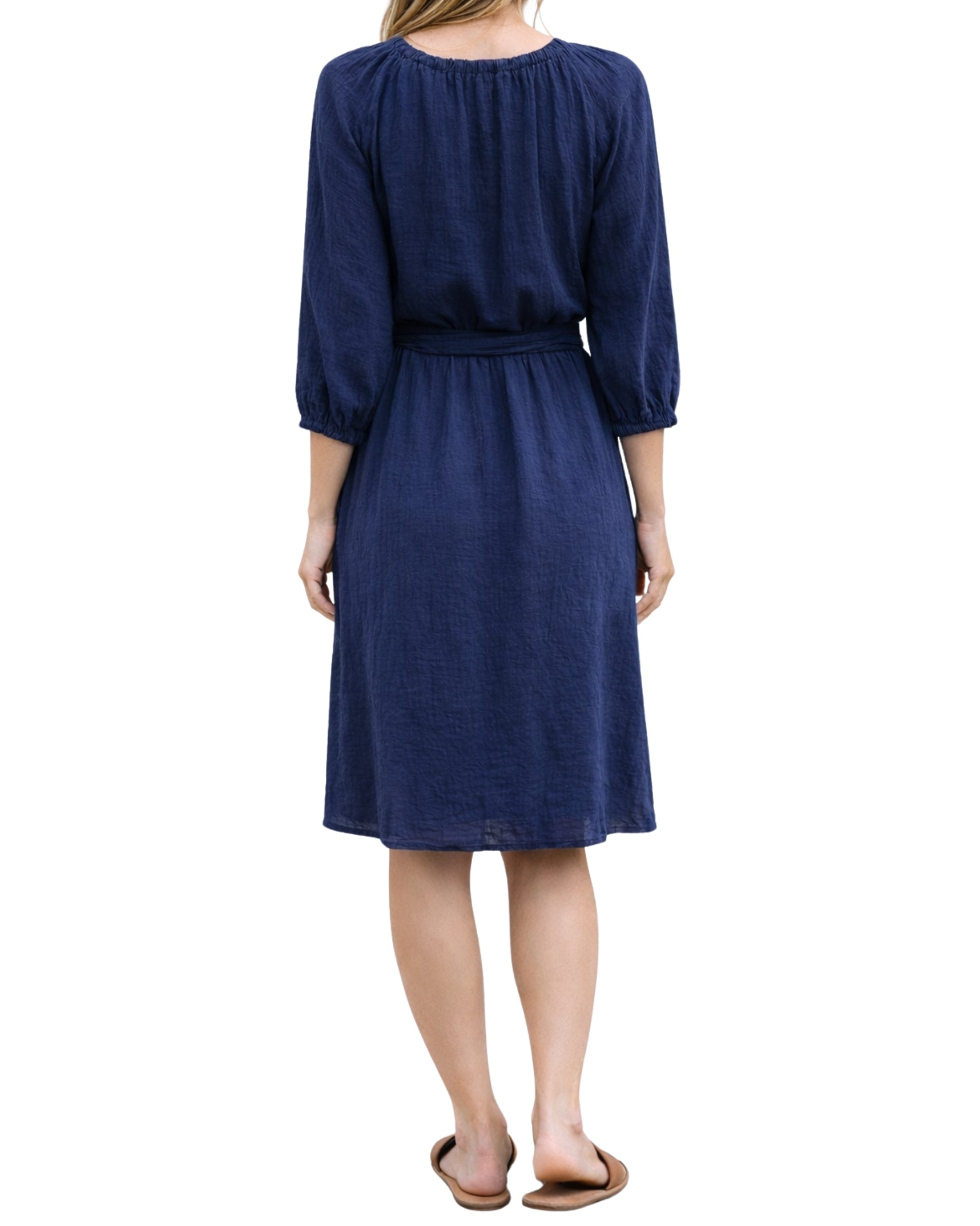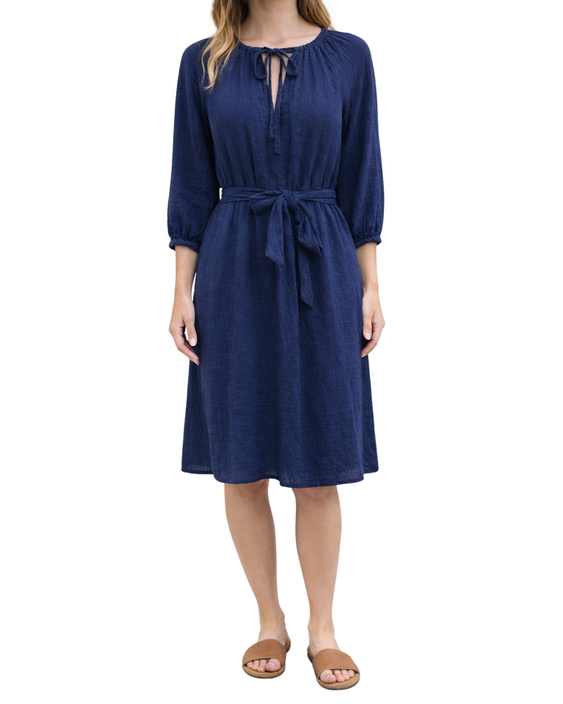 Women, 3/4 Sleeve, V Tie Neck, 2 Pockets, Gentle Elastic Cuffs, Adjustable Self Tie Waist Belt, Soft, Lightweight Textured Fabric, Relaxed Yet Flattering Fit, 100% Cotton