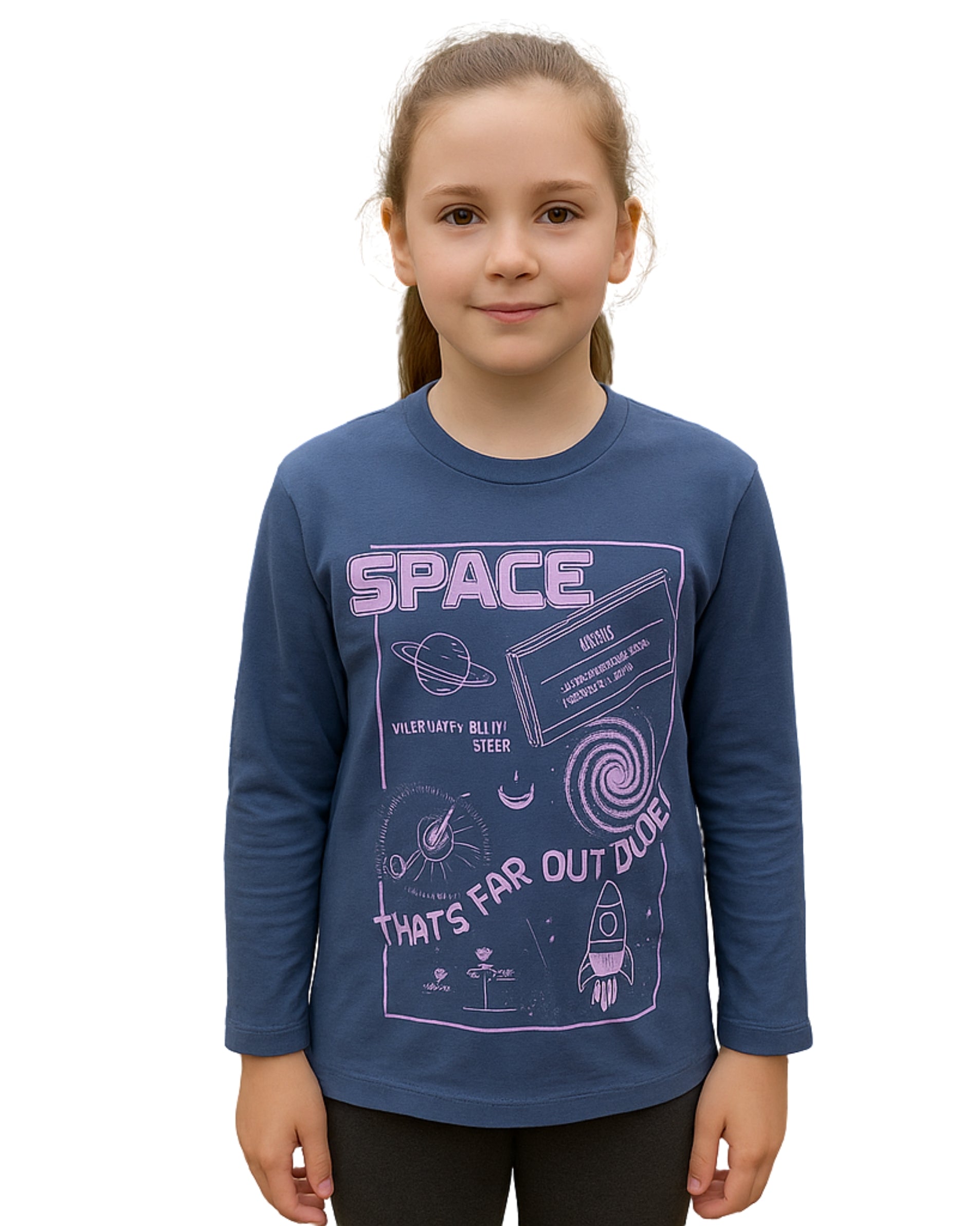 Girls, Long Sleeve, Crew Neck, Front Space Pattern, Soft, Casual, 60% Cotton, 40% Recycled Polyester