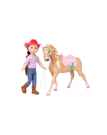 Jump Into Dazzling Adventures With Jaime & Jumper, Jaime Has Bright Blue Eyes, Long Eyelashes, and Long, Silky Brown Hair that's Fun to Brush and Style, Jumper Has a Beautiful Tan Coat with Glittery Pink Hooves, a Removable Saddle, and a Soft Blonde Mane With a Pink Hair Tinsel Styled in a Cute Braid