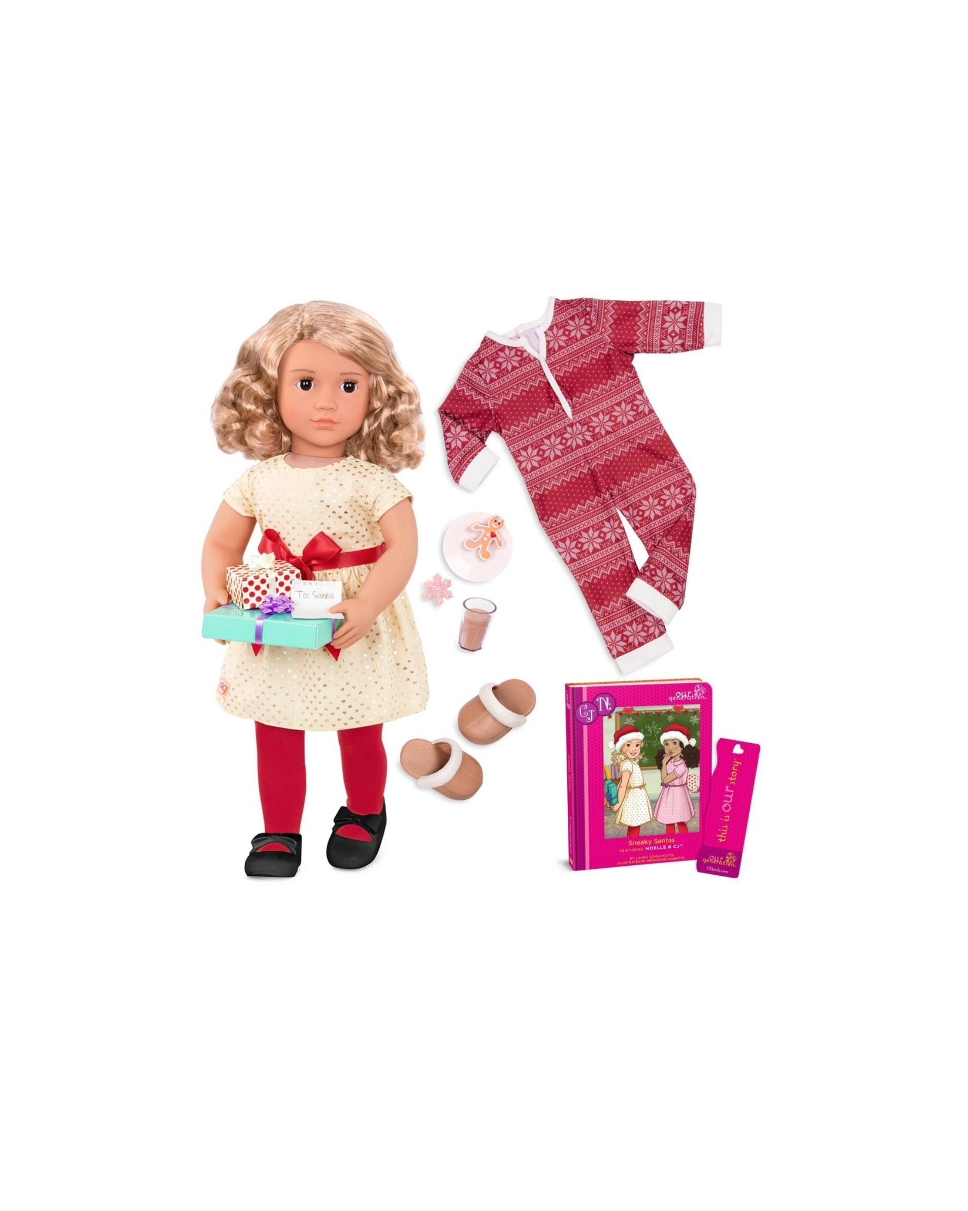 Noelle Arrives Wearing a Stunning Dress with a Mini, Golden Heart Pattern and a Bright Red Bow at the Waist, She also Comes Ready for Nighttime with a Pretty Snowflake Themed Onesie, Accessories Include a Plate of Cookies, Glass of Chocolate Milk, Letter to Santa, and 2 Presents to Set the Perfect Holiday Scene