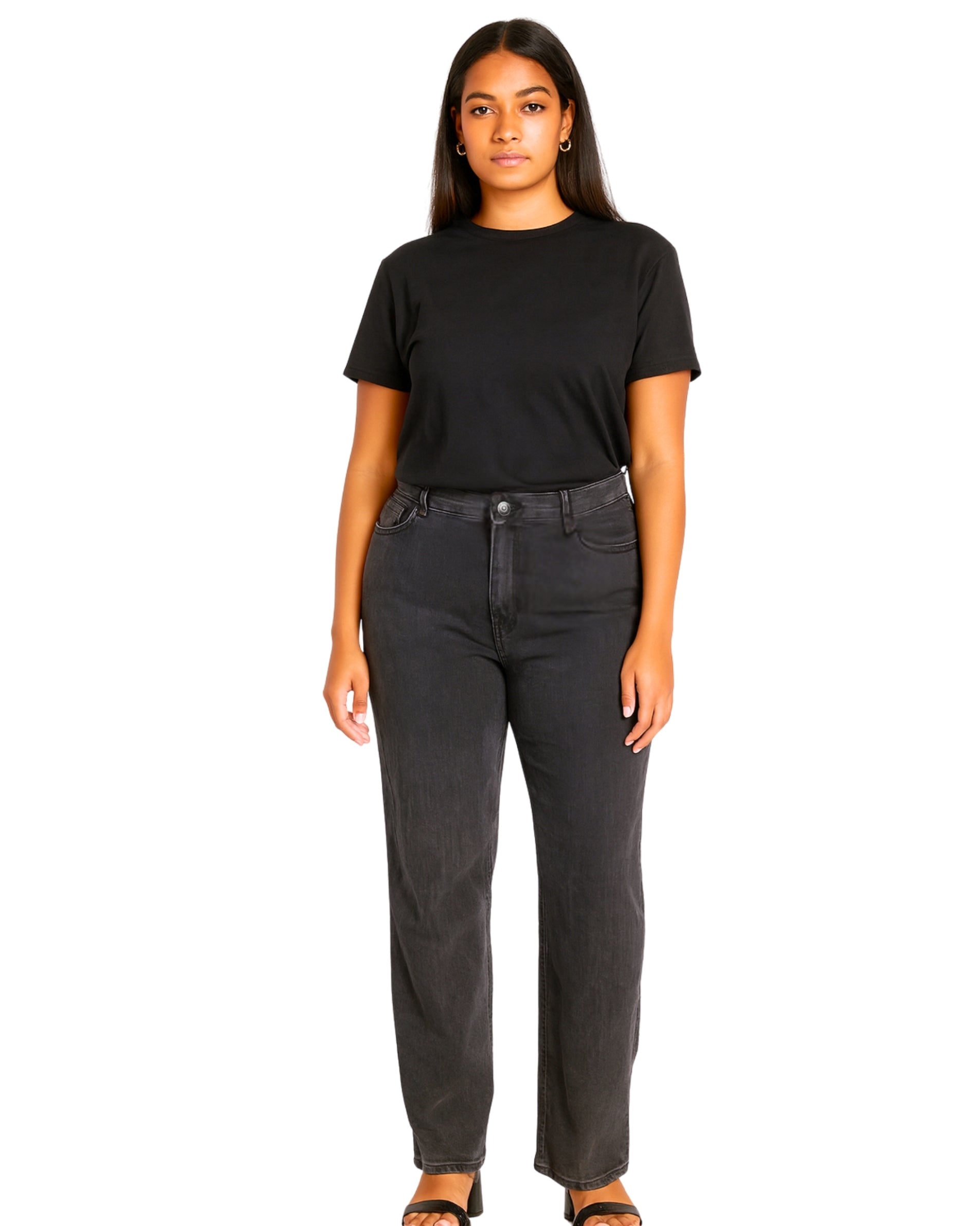 Women, Pant Jeans, Regular jeans, High waist, Contains recycled cotton, Straight cut, Belt loops, Buttoned and zipped opening, Fancy rhinestones on the front