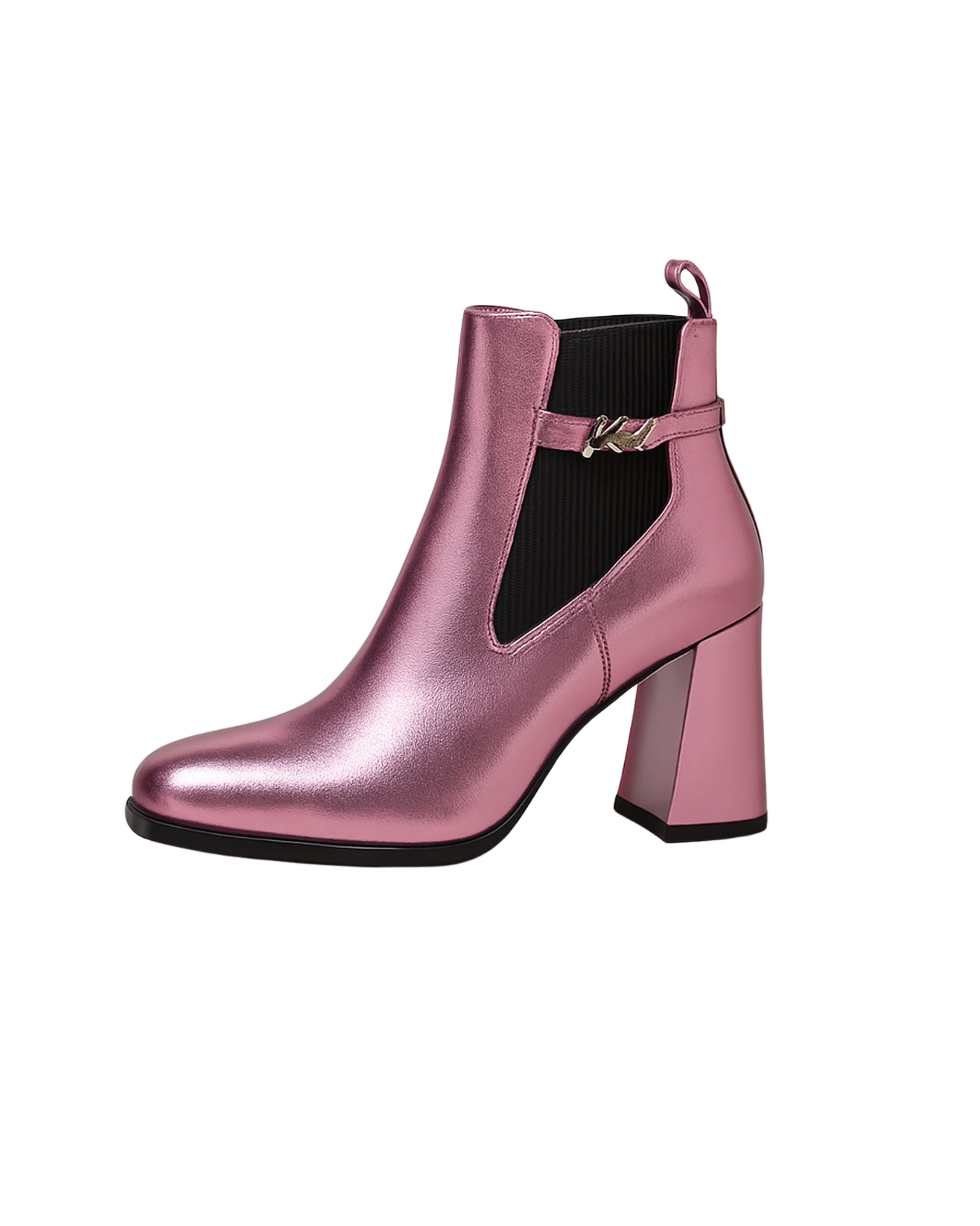 Women, Slip On, Heel, Pointed Toe, Black Ribbed Elastic Side Panels for a Snug Fit, and a Decorative Strap with a Karl Lightning Bolt Buckle Accent, Metallic Chic Boot
