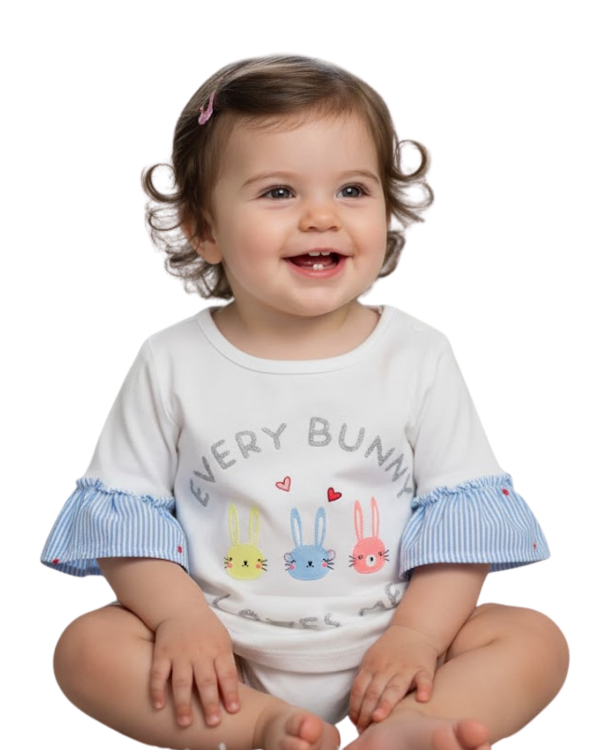 Flouncy Ruffles At The Sleeves, Every Bunny Printed, Crew Neck, 100% Cotton