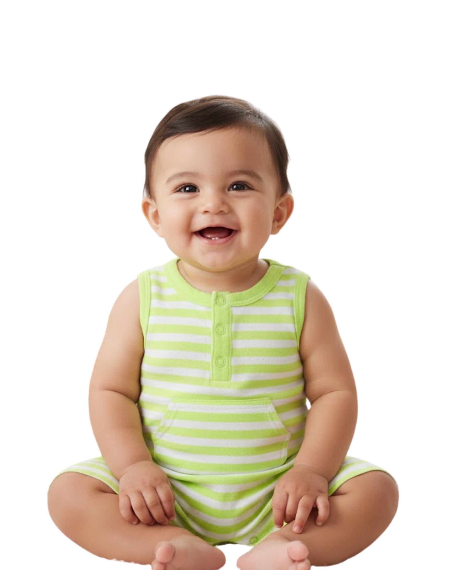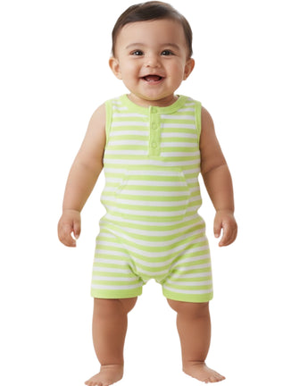 Henley Button Front, Sleeveless, Crotch Snap Closure, Functional Kangaroo Pocket, Allover Stripe Print