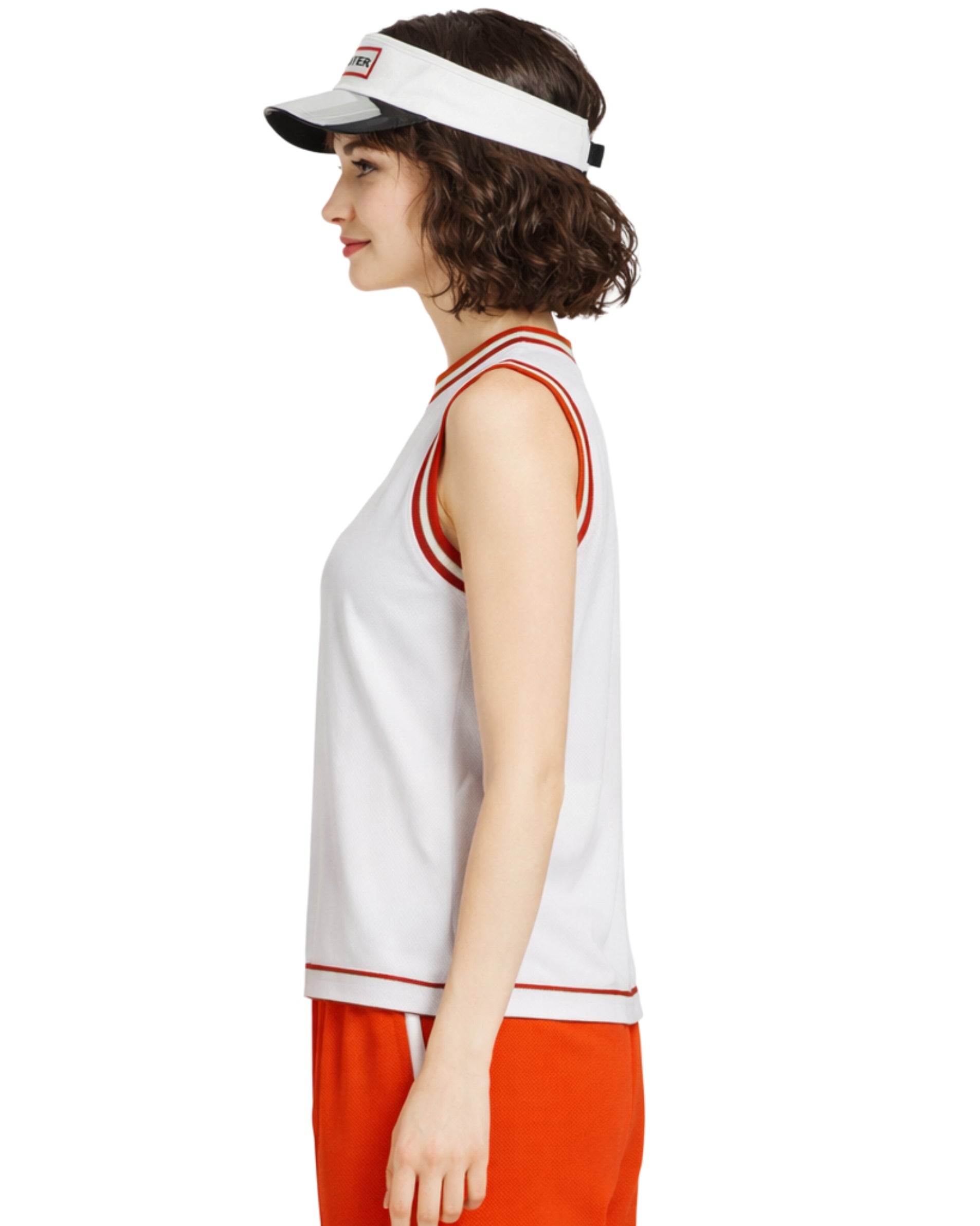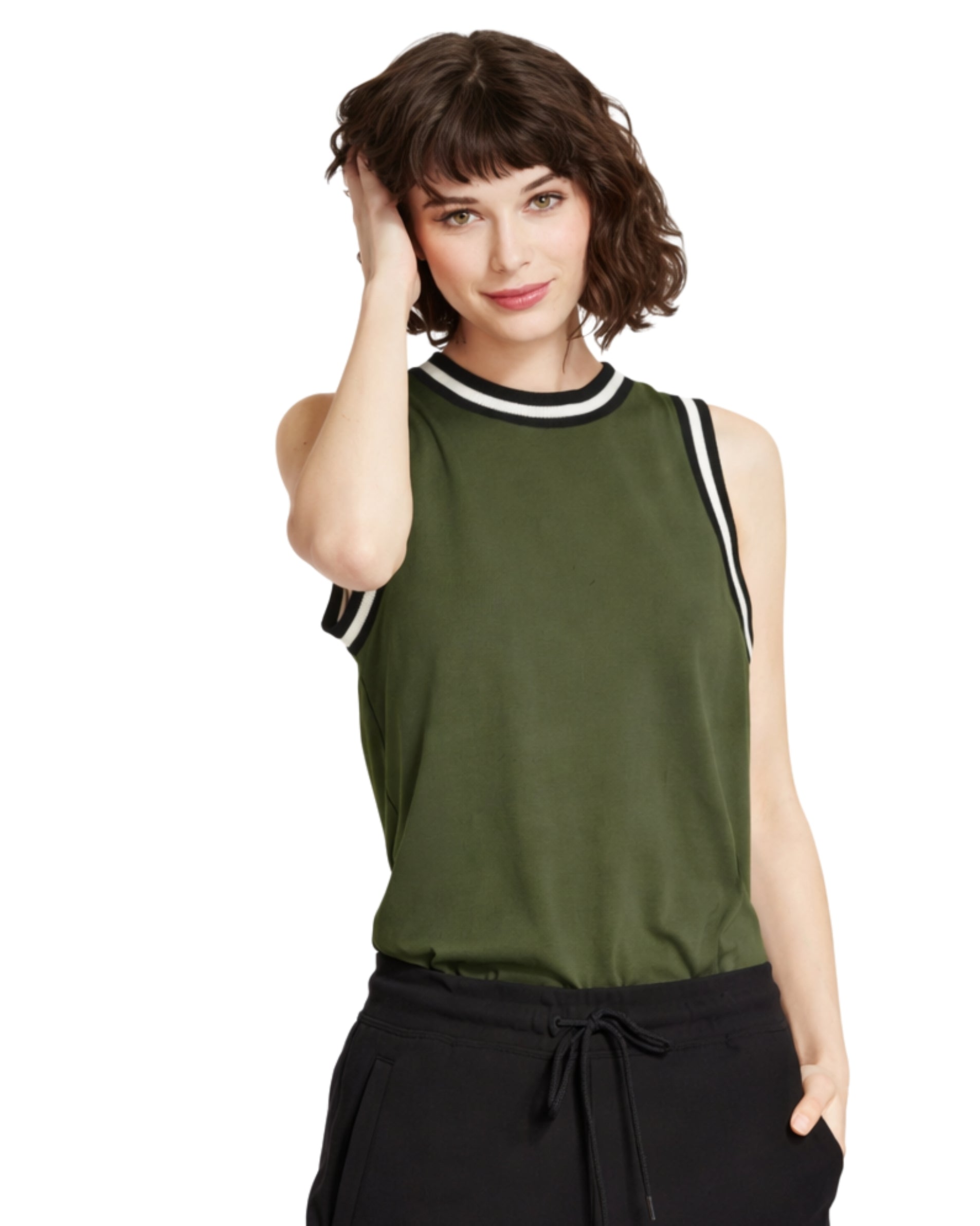Sleeveless, Contrast Trim Knit, Crew Neck, Stretch, 57% Cotton, 38% Rayon, 5% Spandex