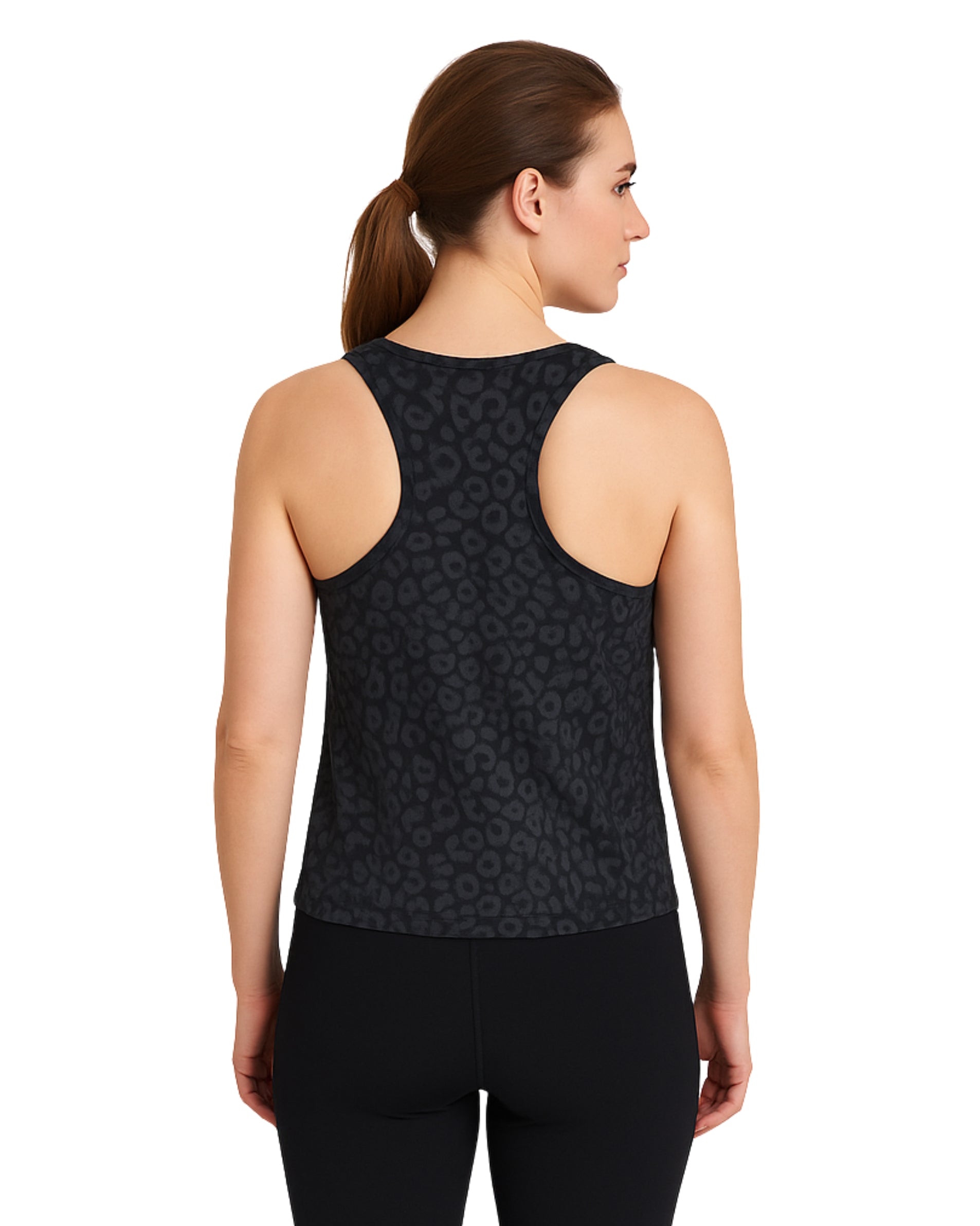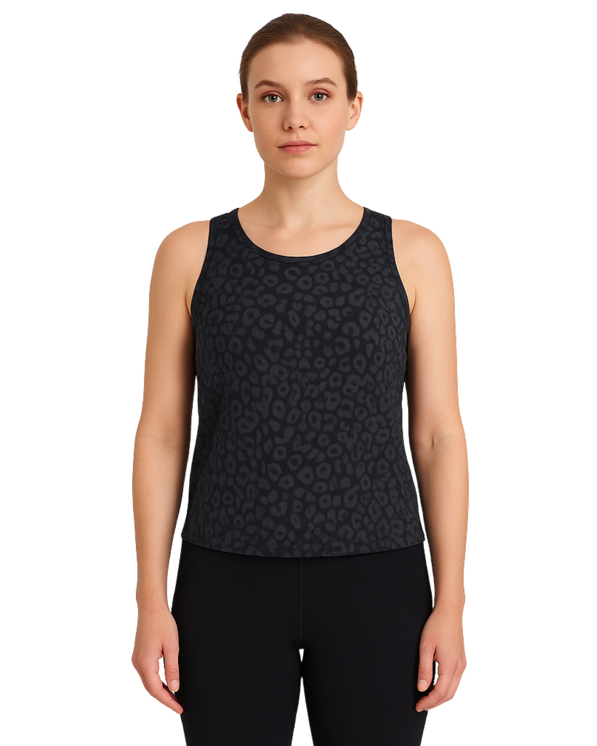 Sleeveless, Round Neck, Racerback Design, Animal Print, Curved Hemline, 80% Nylon, 20% Spandex