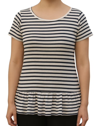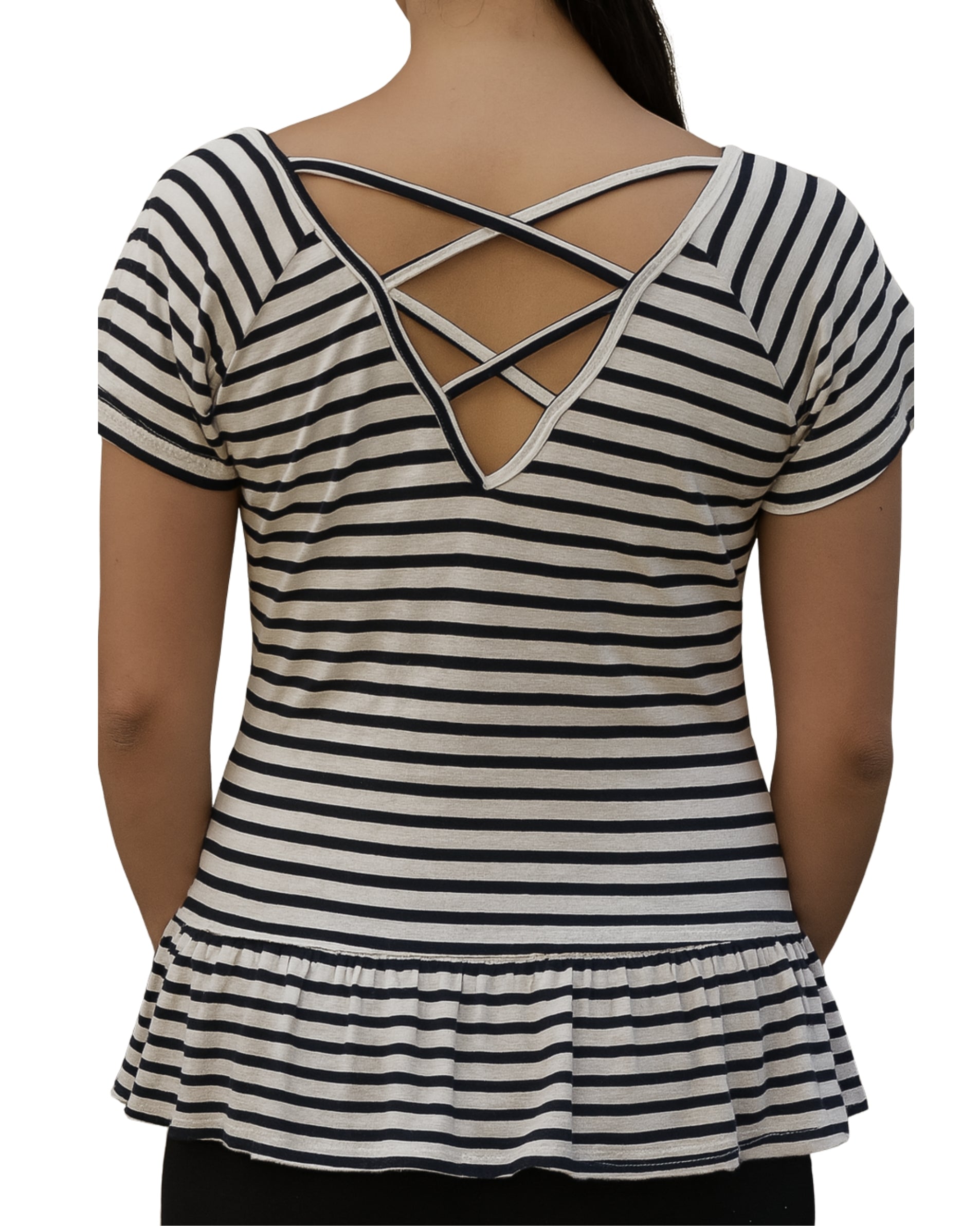 Round Neck, Short Sleeve, Casual, Striped, Cress Cross, Ruffle