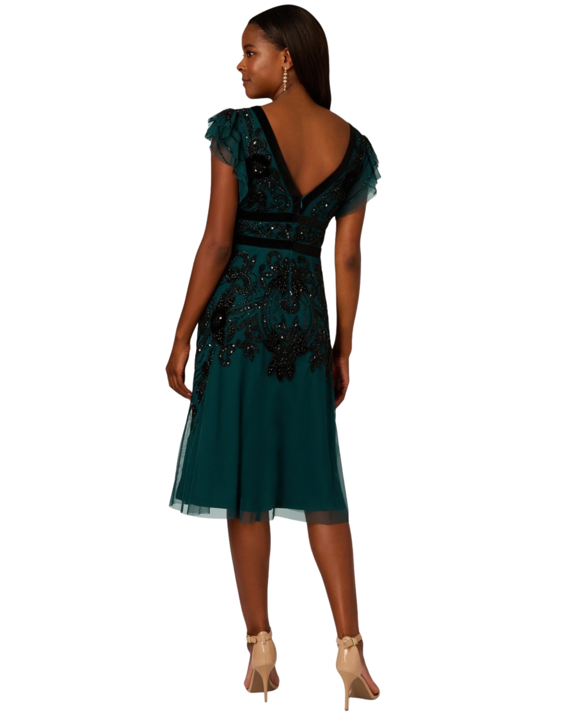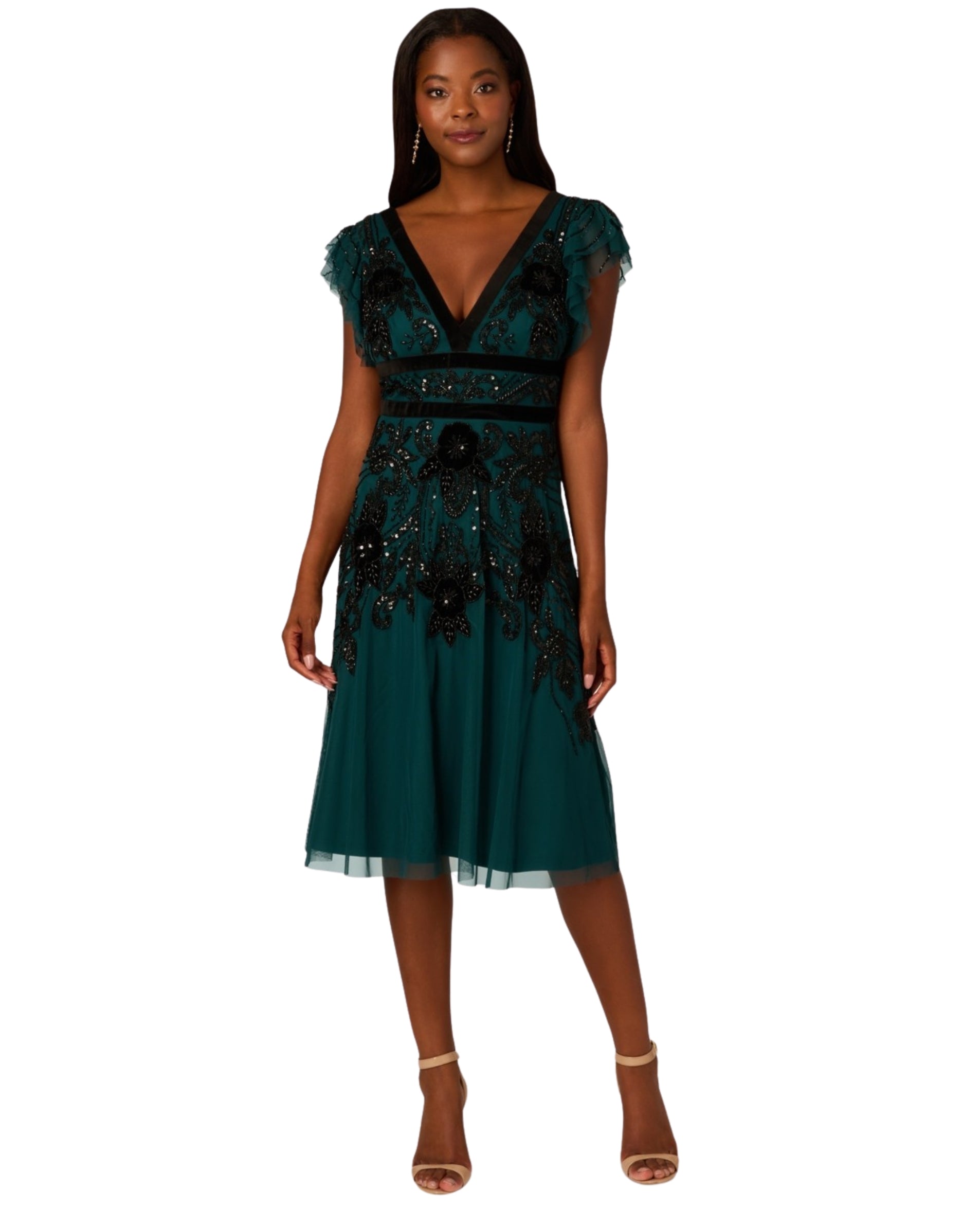 Women, Dress, Falls below the knee to lower calf, V-neck, Midi silhouette, Back zip closure, Short flutter sleeves, Velvet trims at neck and waist; allover bead and sequin embellishments, Damage to beading can occur during try-on or wear, Sequins may shed during wear, Lined