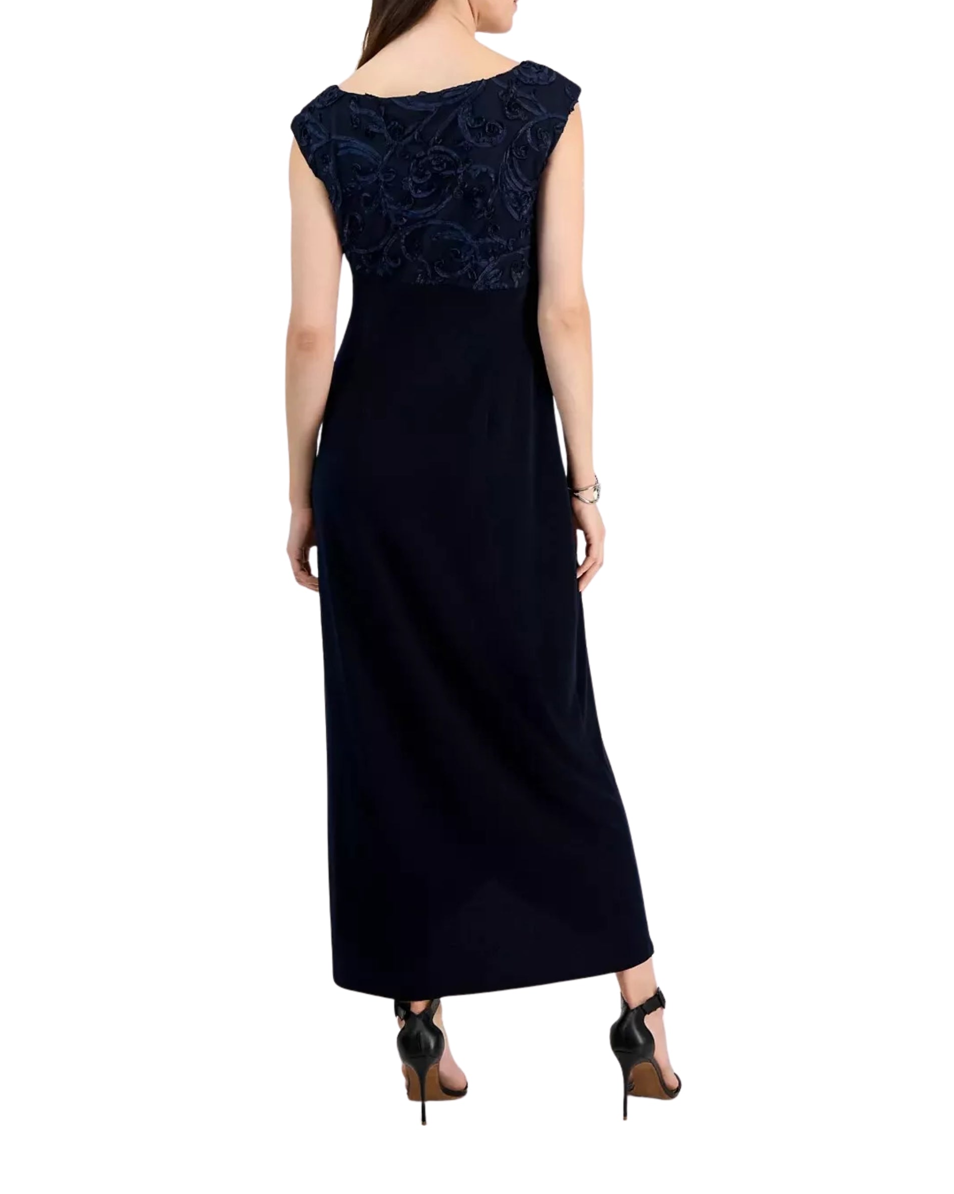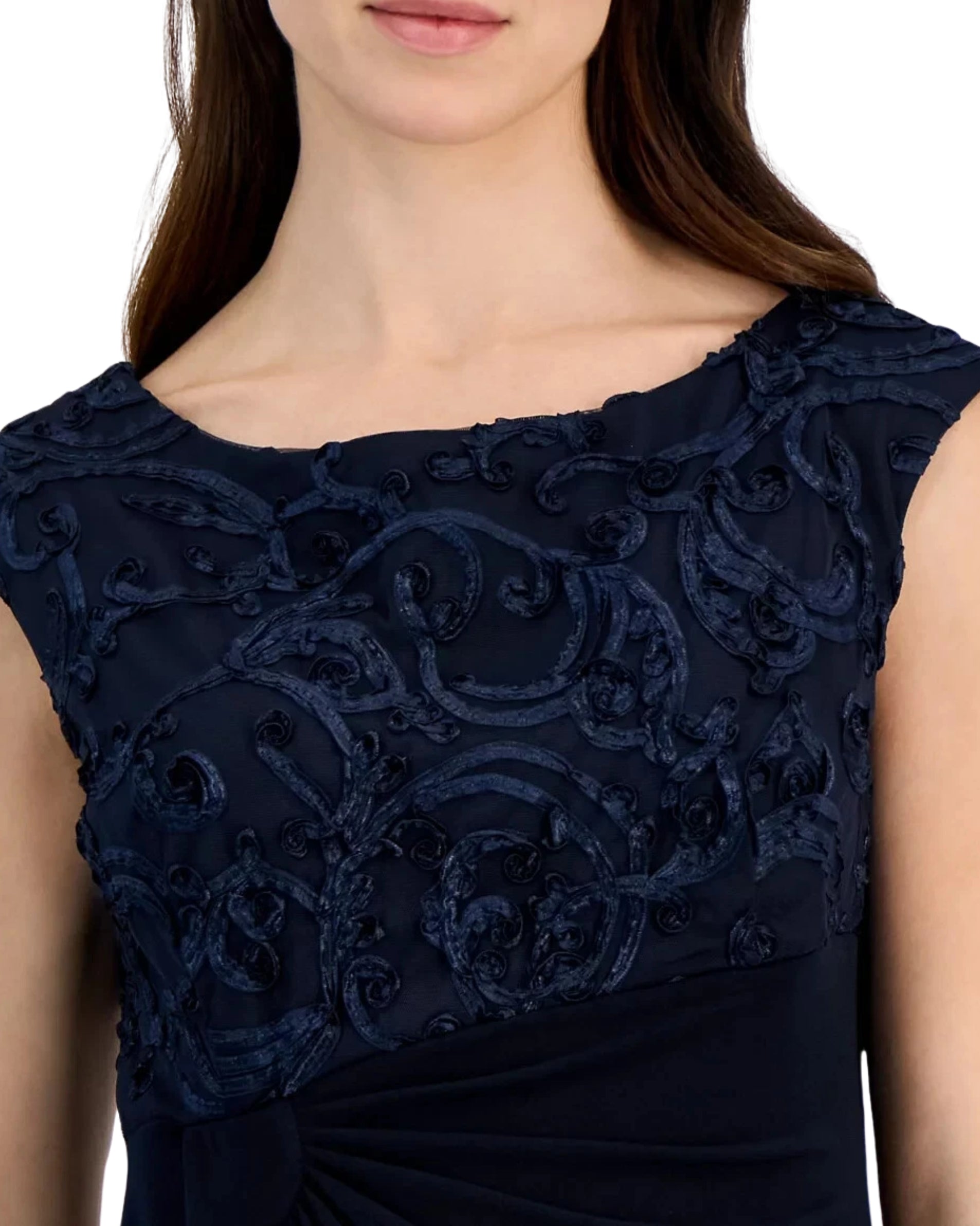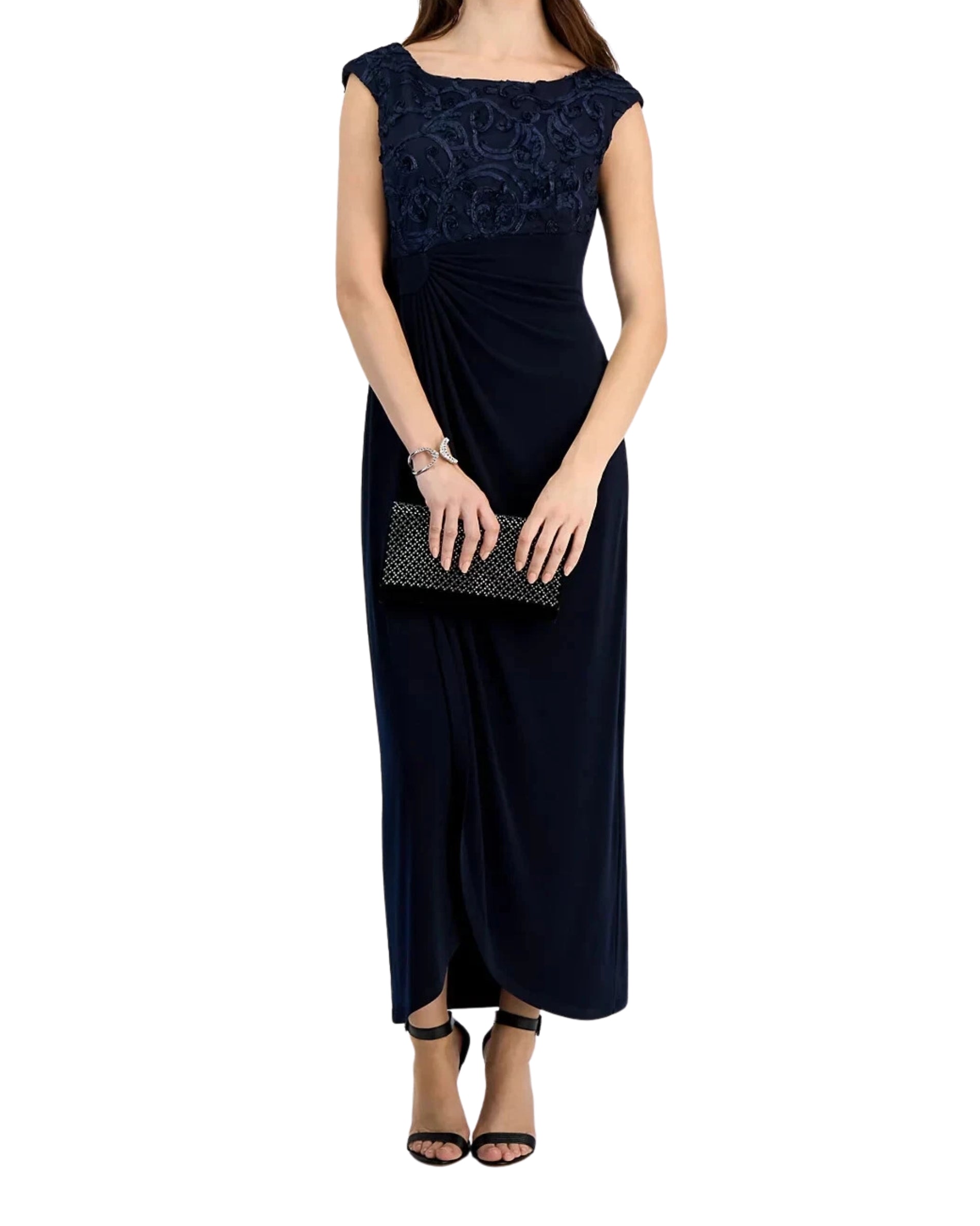 Women, Cap Sleeve, Boat Neck, Matte Stretch Fabric, Intricately Embroidered Lace With Floral & Swirl Patterns, Draped Gathering Detail on the Side Creates a Fattering Silhouette and a Subtle Wrap Effect, Curved Overlap Hem at the Front, 100% Polyester