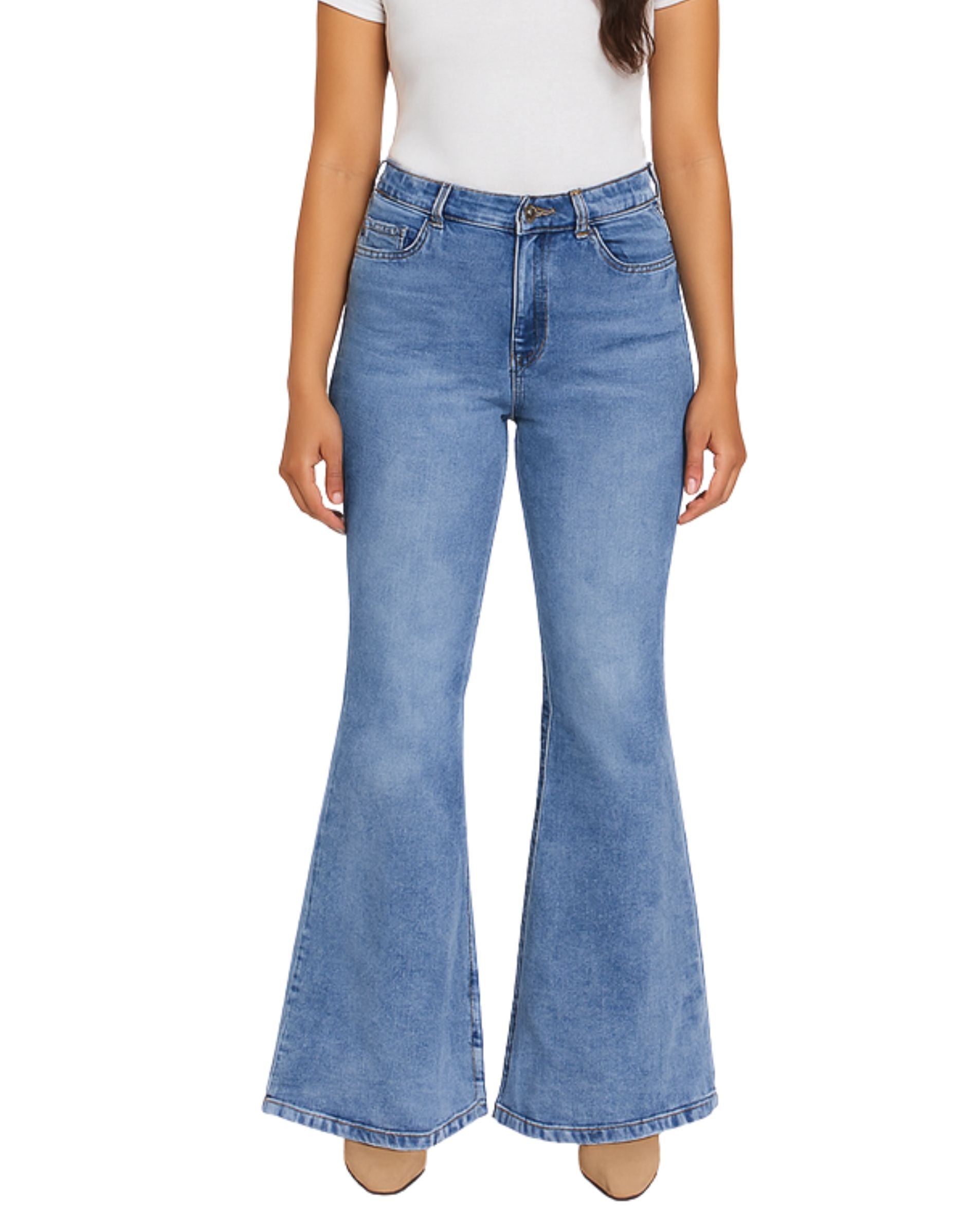 Women, Button With Zipper Closure, Back Poket, Slim Fit, High Rise, Flare, Stylie, 93% Cotton, 5% Polyester, 2% Spandex