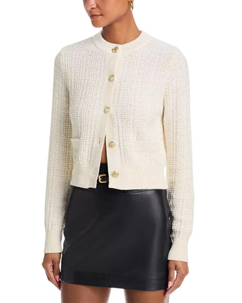 Women, Long Sleeve, Crew Neck, Button Down, 2 Pockets, Soft, Rib, Lurex Tweed, Shimmer, 60% Cotton, 39% Polyester, 1% Metallized Fibers