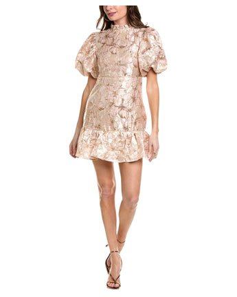 Women, Feminine, Elegant, Floral Textured Pattern, High Neckline, Ruffled Hemline, Fit&Flare, Dramatic Puff Short Sleeves