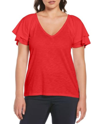 Ruffle Sleeve, V Neck, Casual, 60% Cotton, 40% Modal