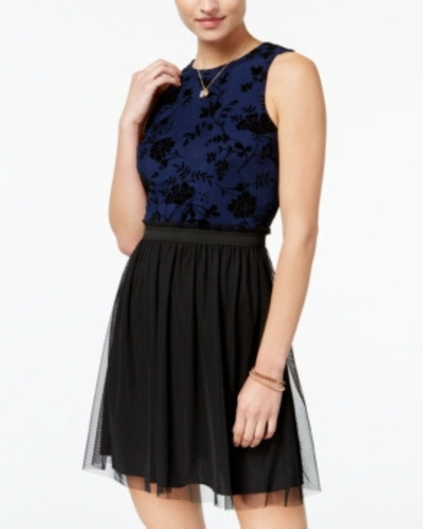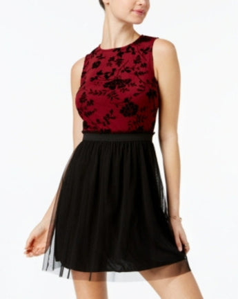 Sleeveless, Concealed Back Zipper, Round Neckline, Fit & Flare Silhouette, Flocked Bodice, Mesh Overlay At Skirt With Elastic Paper Bag Style Waist