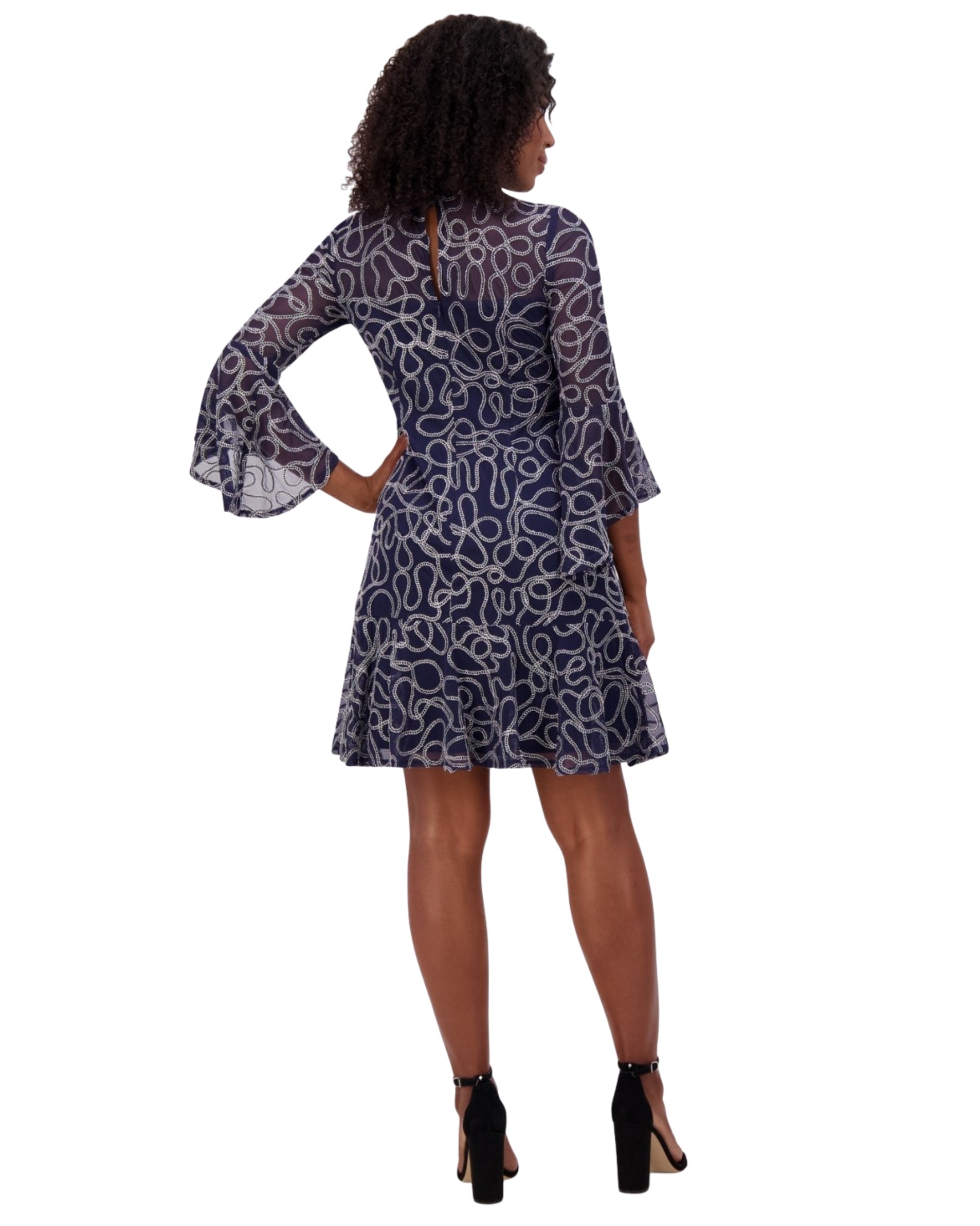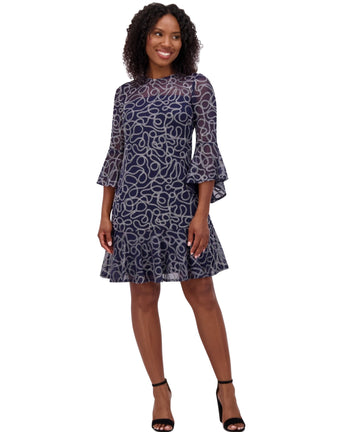 Women, Dress, Fitted through the chest and waist, structured A-line skirt sits slightly over hips, Jewel neckline, A-line silhouette, Back zip closure, 3/4-bell sleeves, Illusion yoke, flounce hem, Lined\nJewel neckline; A-line silhouette\nBack zip closure\n3/4-bell sleeves\nIllusion yoke; flounce hem\nLined
