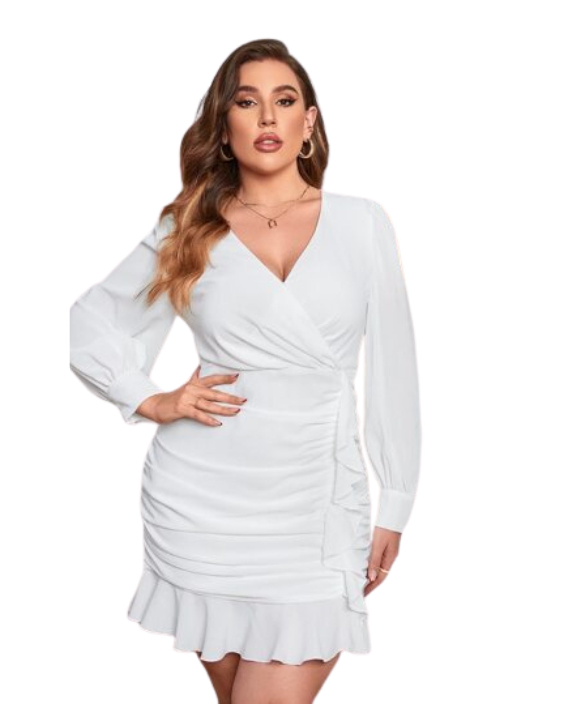 Women, Solid Sheath Dress, V-neck, Long Puff Sleeves, Above knee length in asymmetric hem