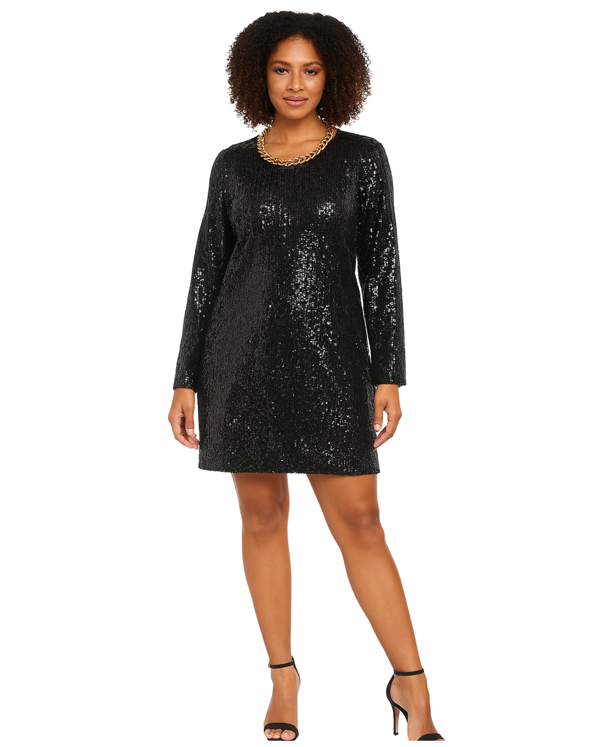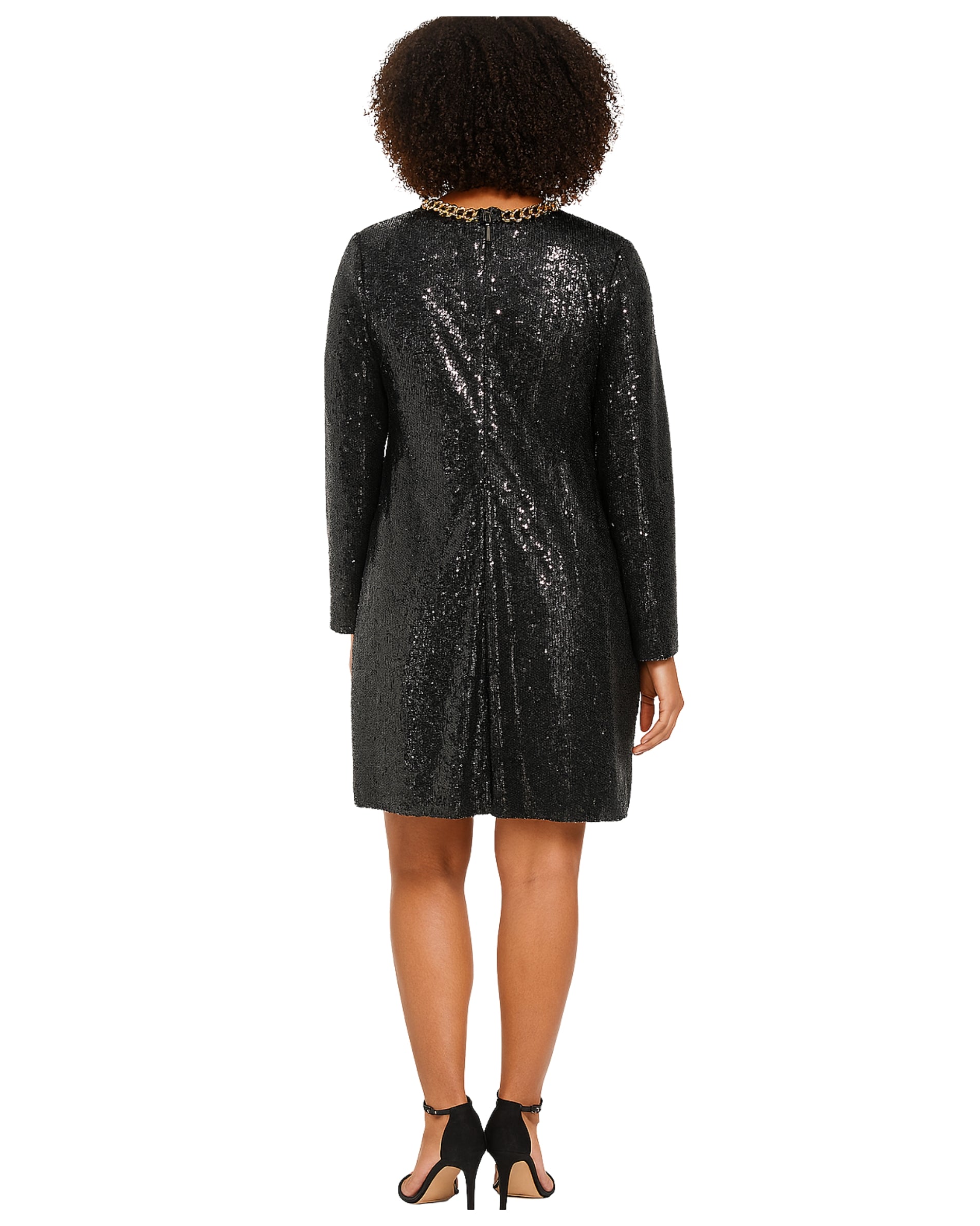 Women, Casual, Stylist, All-Over Black Sequins, Round Neckline With Chunky Gold Chain Trim, Long Sleeve, Mini Length, Shimmering, Back Zipper Closure