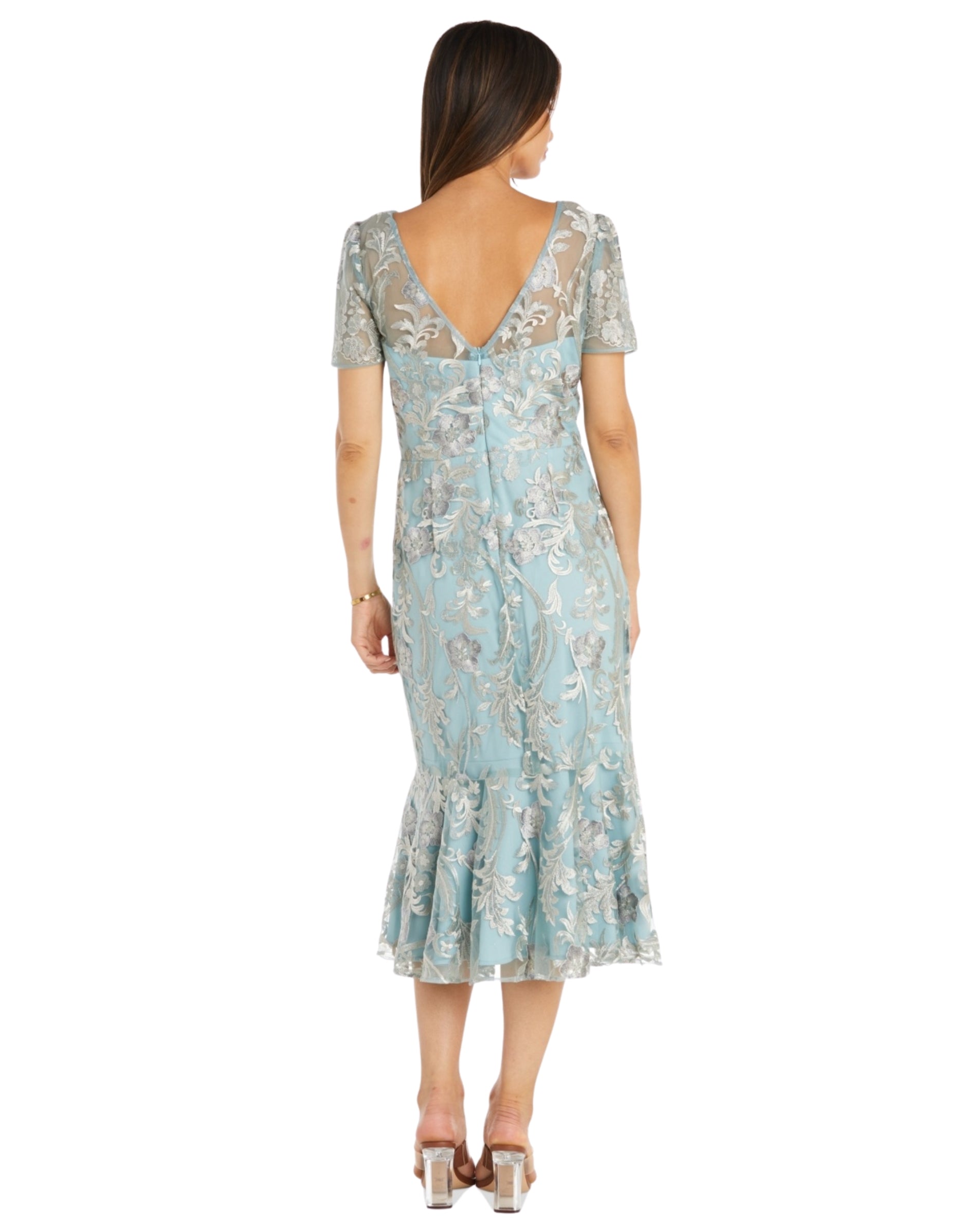 Women, Embroidered Tea-Length Flounce Dress size 10 P. A flounce hem and embroidered design gives a subtle nod to a chic 20's style, R & M Richards knows how to create a classic look, Product Features, Approx. 37-3/4" long from center back neck to hem, Length is based on size 10 and varies 1/4" between sizes, Fit & Flare: Fitted through the chest and waist, flared and flowing skirt