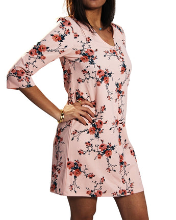 Women, 3/4 Sleeve, Floral, Midi Dress, Faux Button, Pull On, 97% Polyester, 3 % Elastane