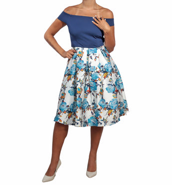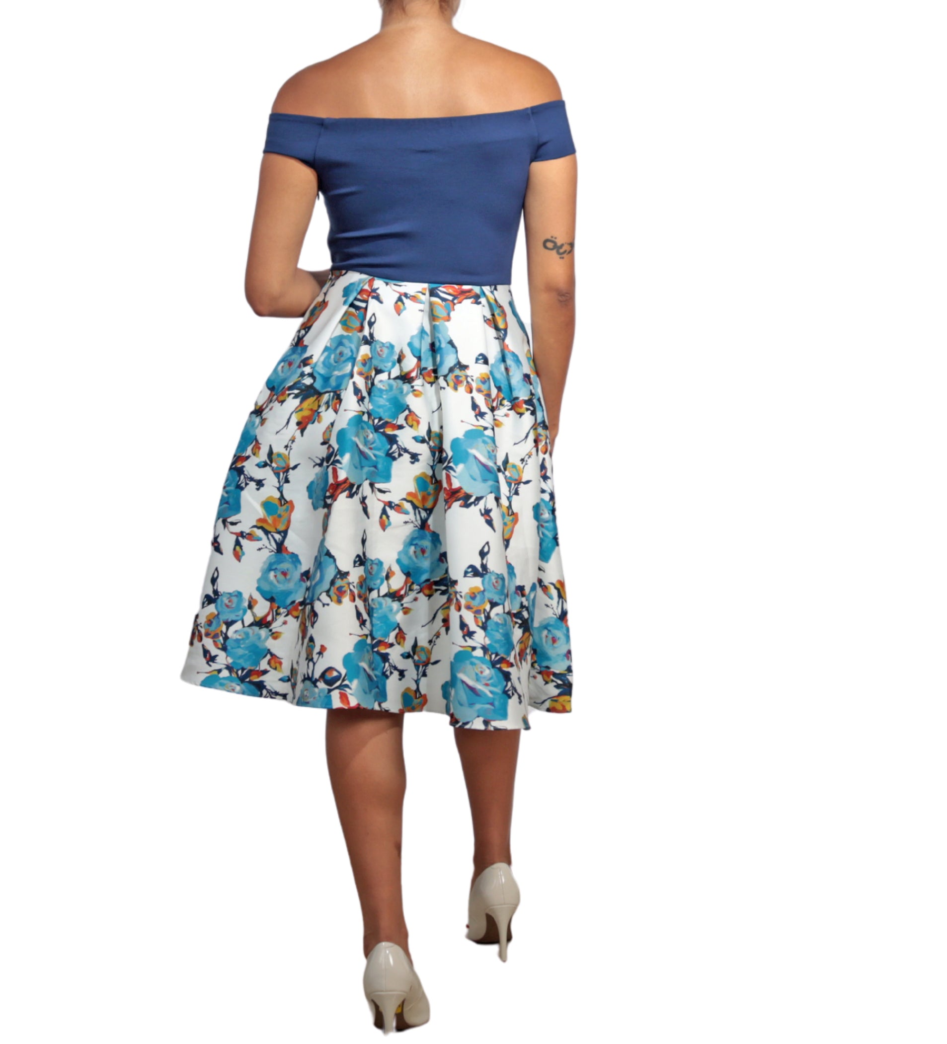 Women, Contrasting Floral Fluffy Skirt, Fastens With A Hidden Side Zipper, Midi And Below The Knee, Smooth, Off Shoulder, Fitted, High Quality