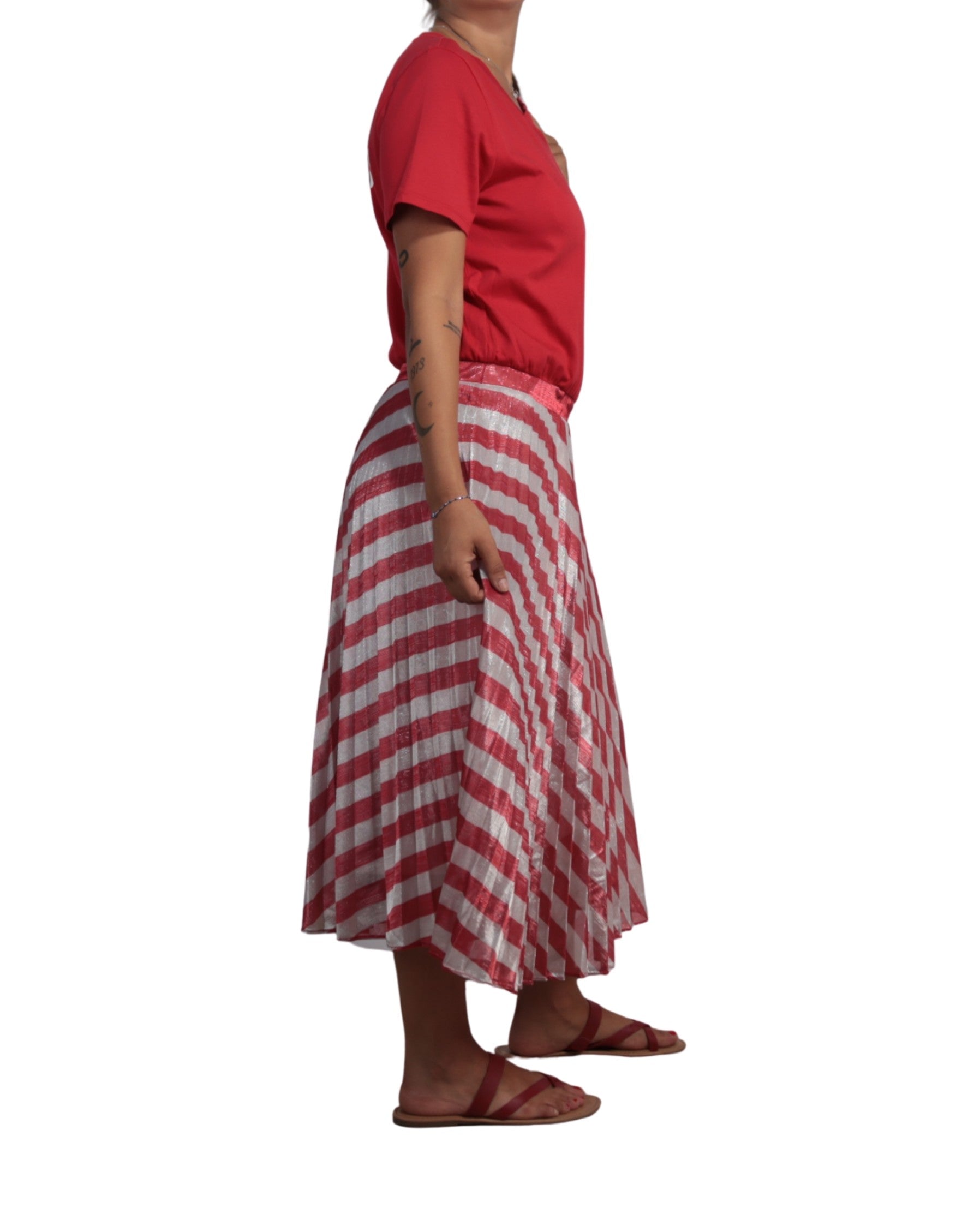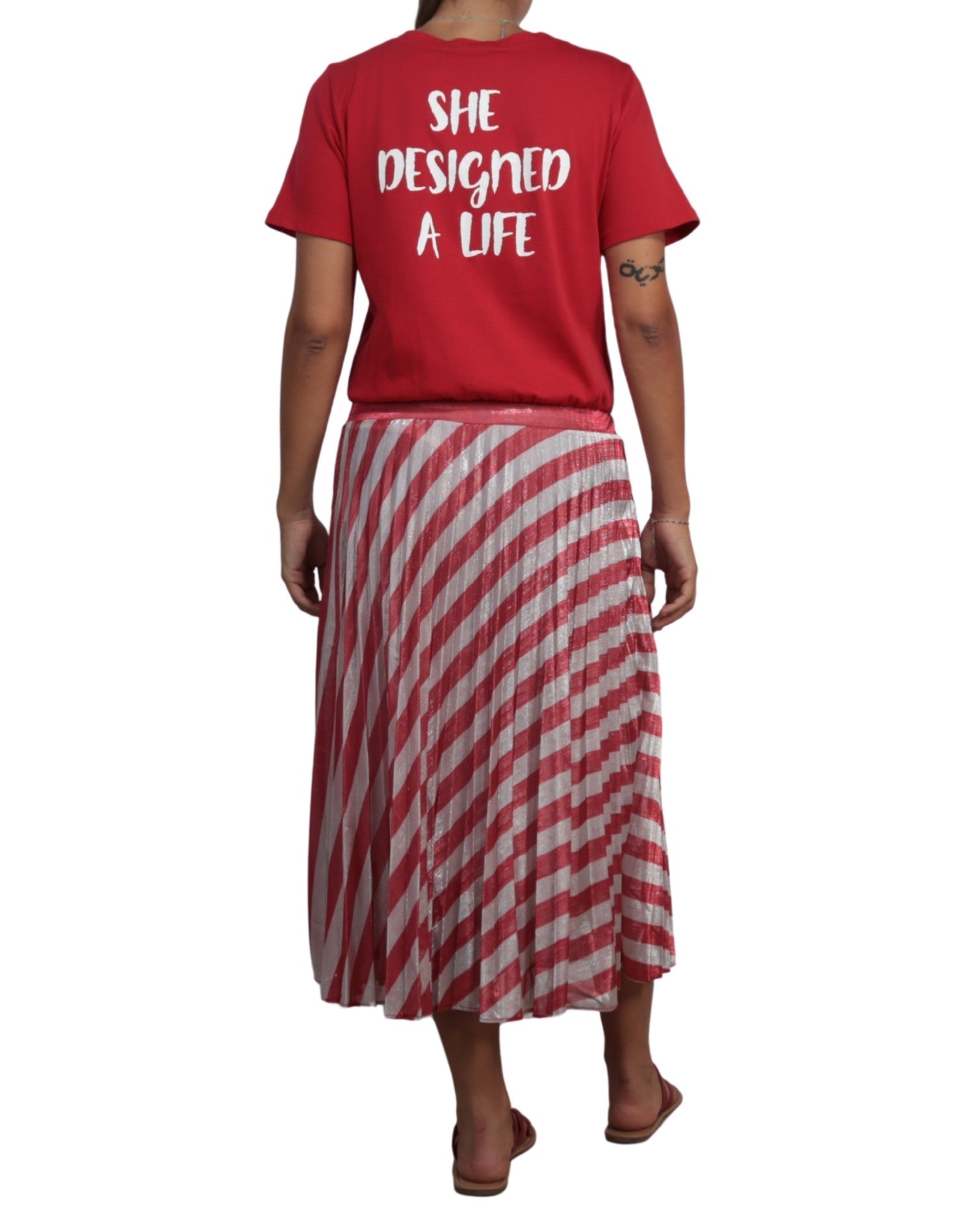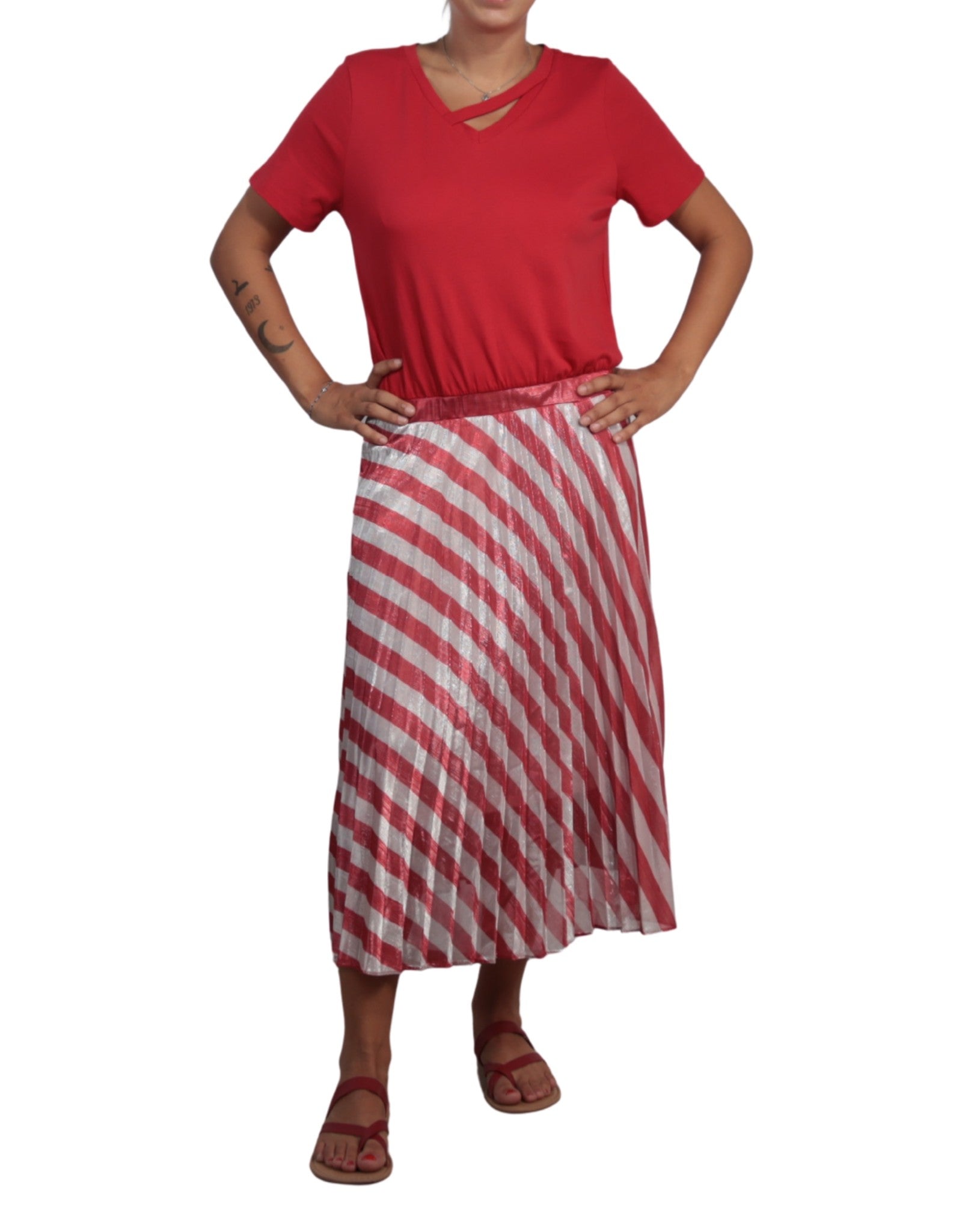 Women, Short Sleeve, V Neck, Striped Metallic Pleated Skirt Shape, Elastic Waistband For a Comfortable Fit, Back Graphic, Casual, 100% Cotton