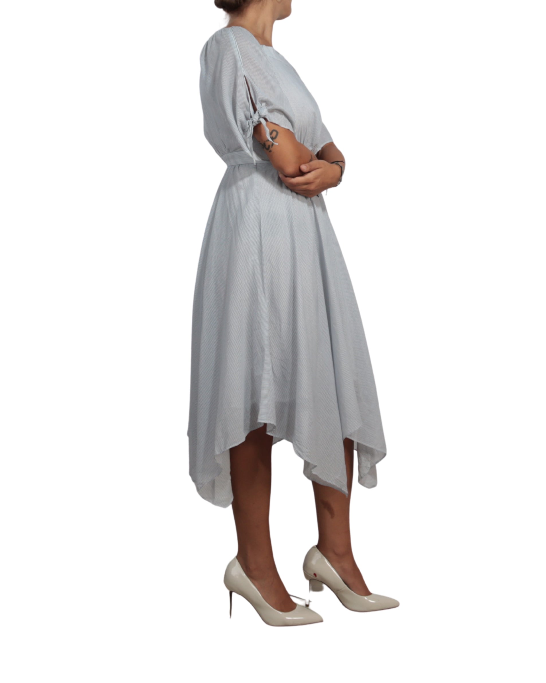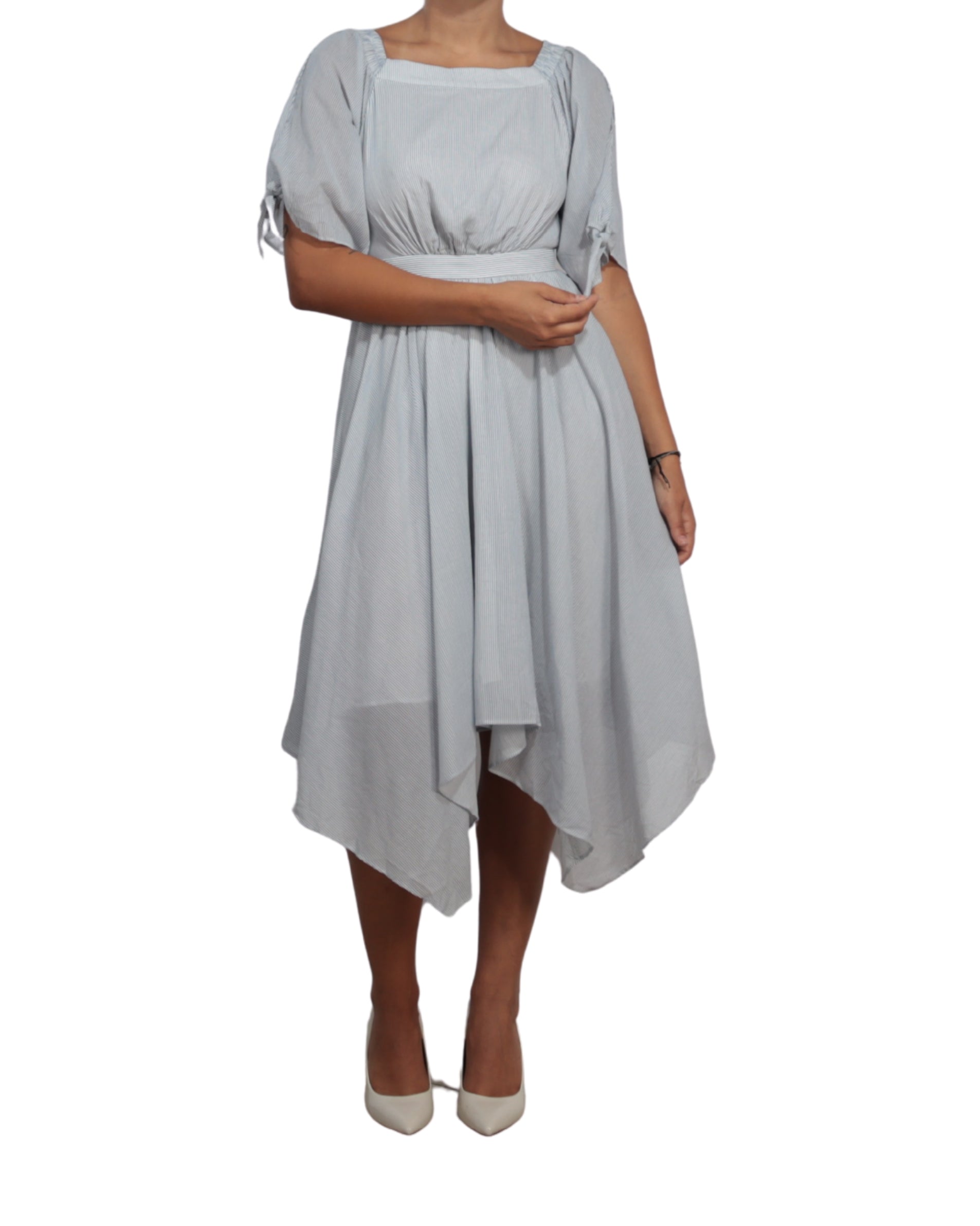 Women, Short SleevePuffed With Adjustable Tie Accents, Square Neck, Back Zipper, Subtle Vertical Pinstripes, Defined Waistband For a Flattering Fit, Asymmetrical Handkerchief Hemline, 100% Cotton