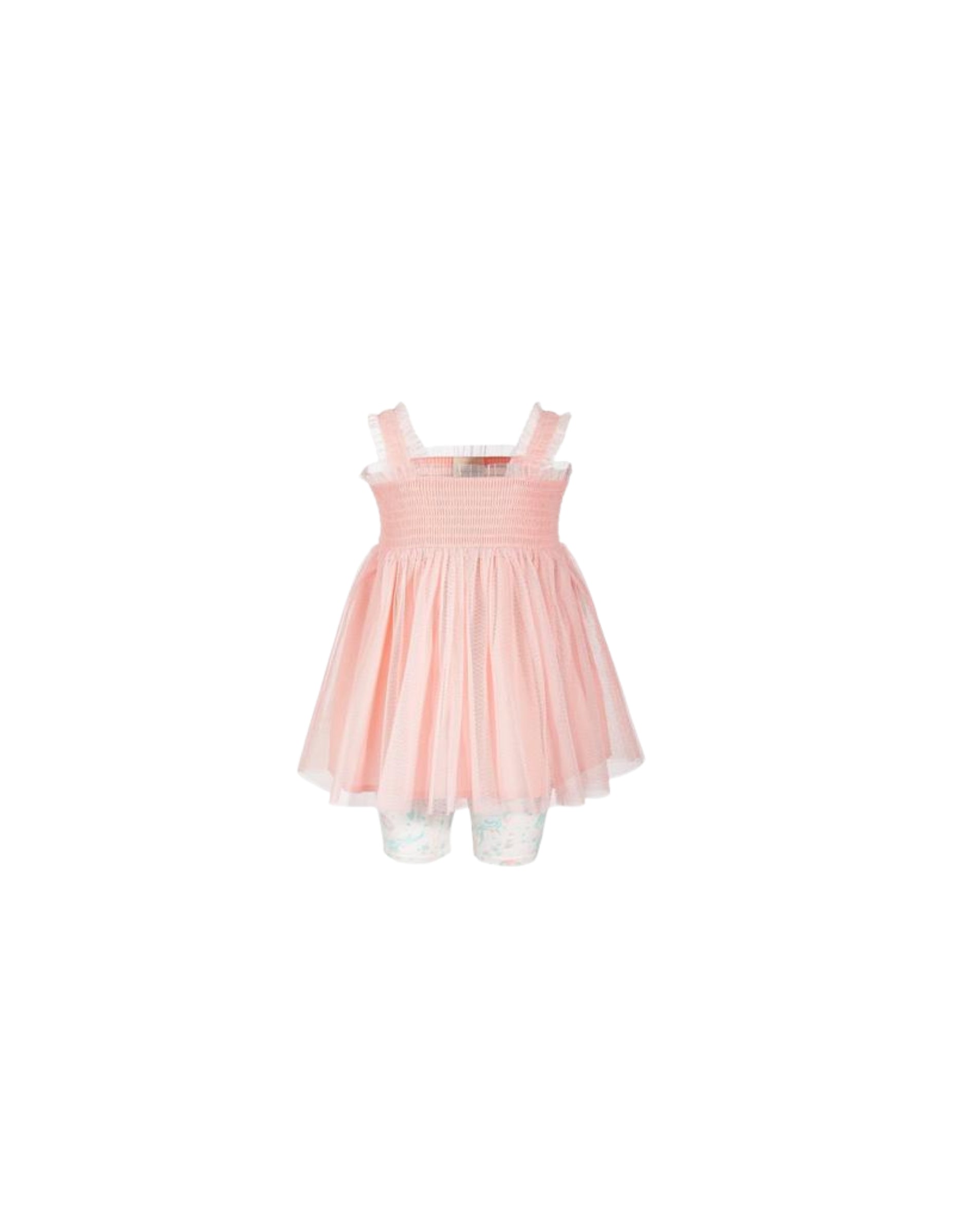 Pink Lining Tulle-Overlay Smocked Tunic & Floral Short, Casual Short,  Newborn. This sweet set includes a tulle-overlay tunic, plus coordinating elastic-waist floral short.Include one pink lining sleeveless tulle tunic and one pair of coordinating white and aqua floral short