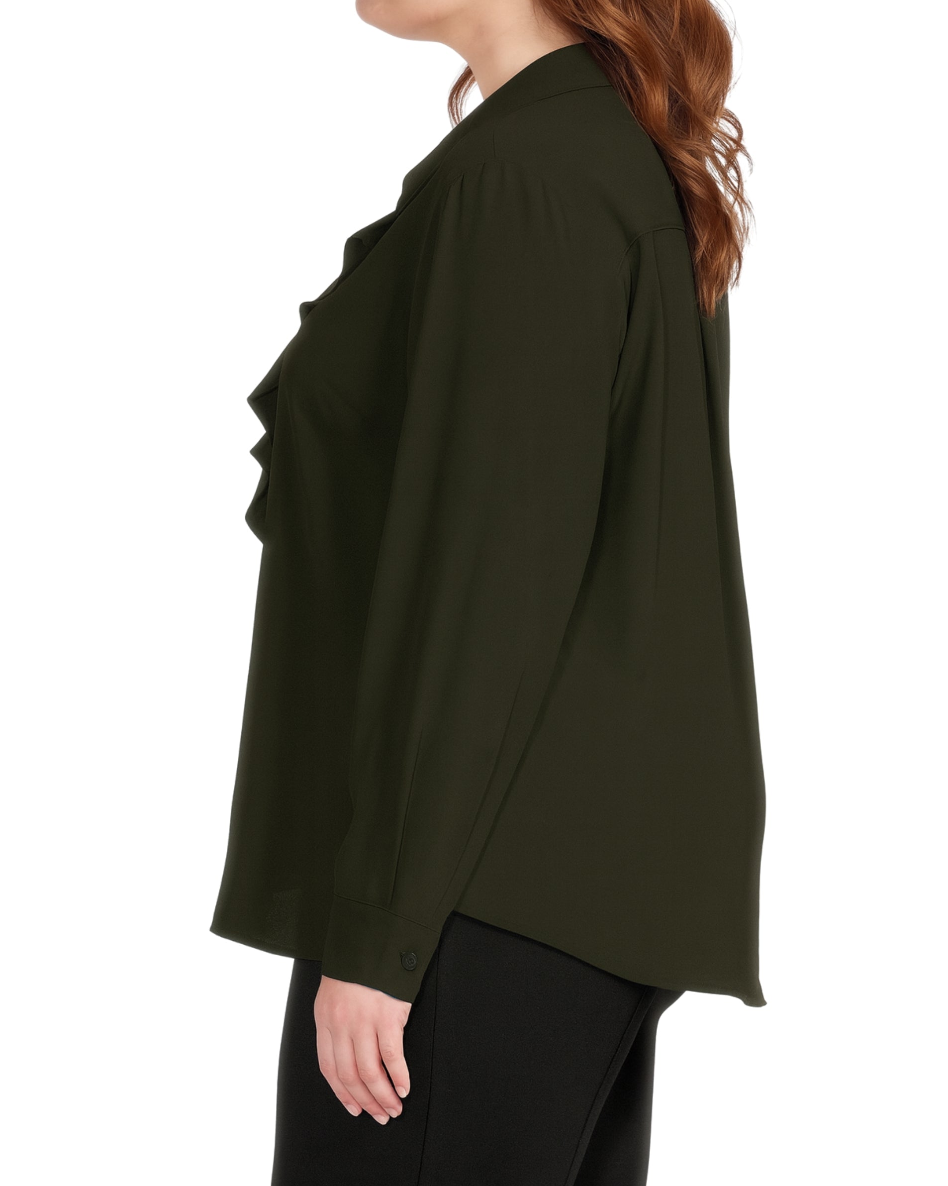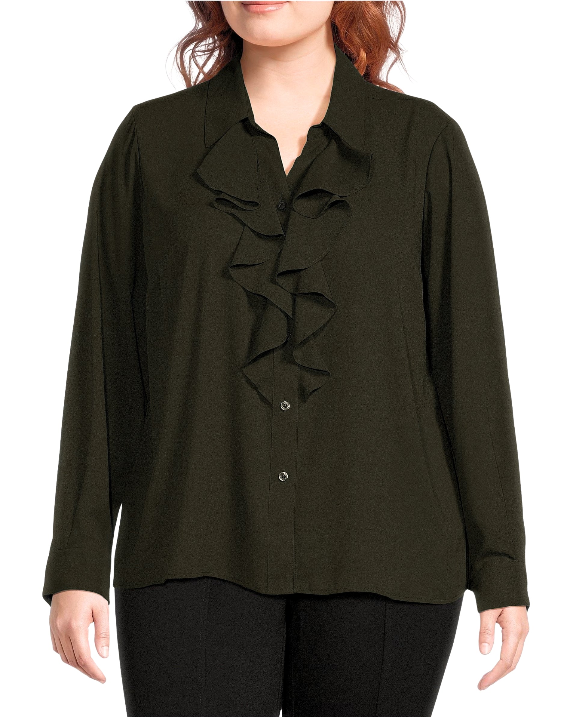 Women, Shirt, Long Sleeve, Hits at hips , Spread collar, Button front closures , Ruffles at front , Long sleeves with button at cuffs , 100% polyester