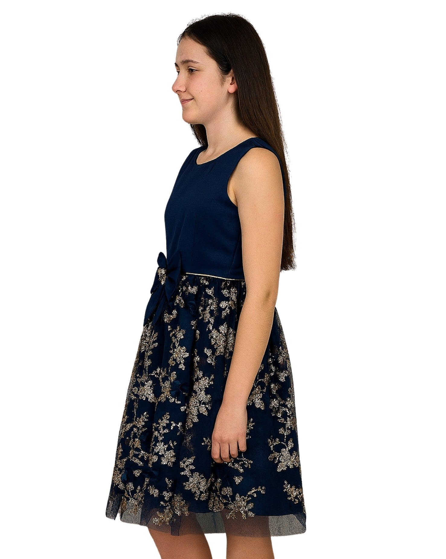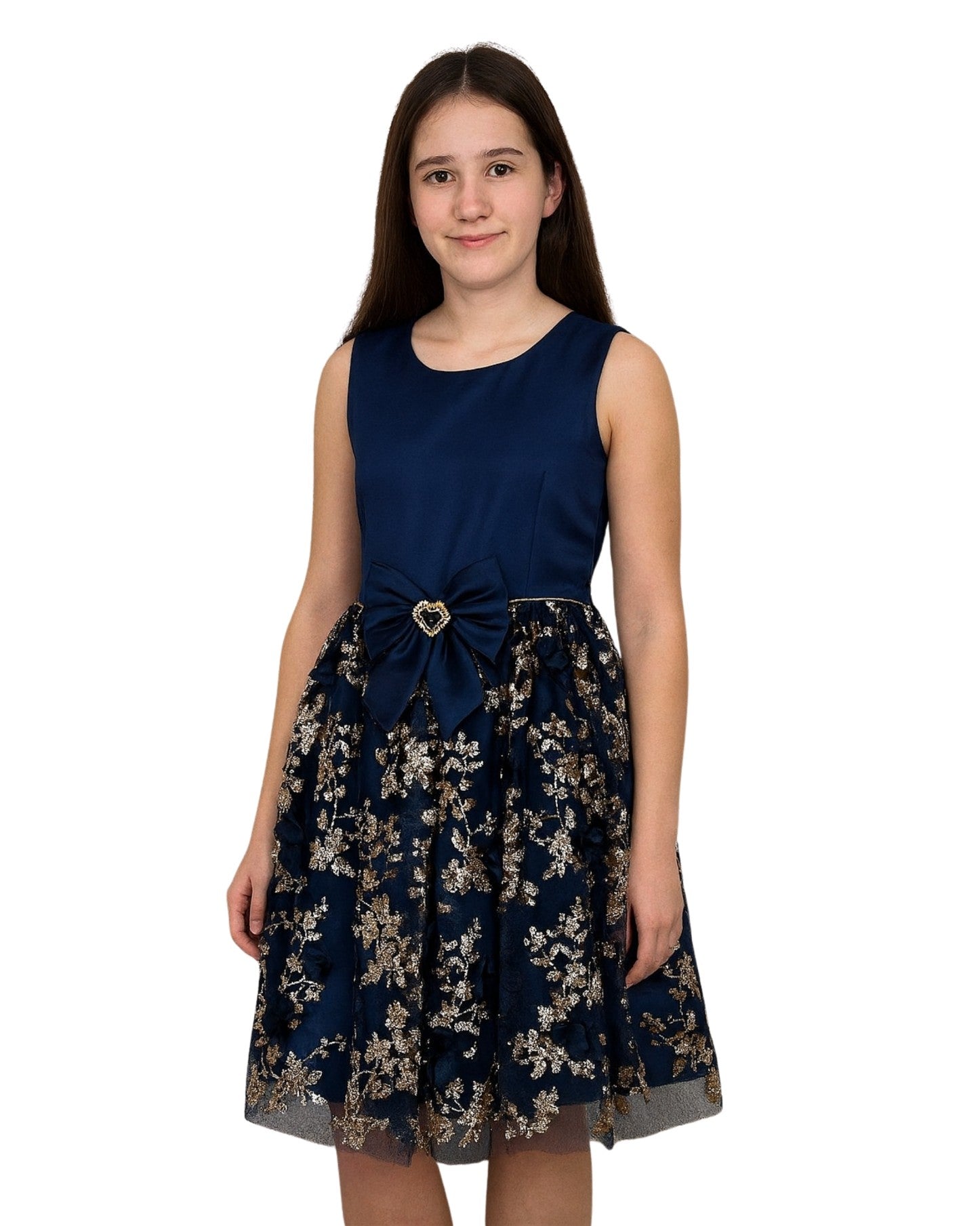 Women, Sleeveless, Round Neck, Back Zipper, Satin, Floral Patterns, Shimmering Gold Thread, Decorative Bow, Gold Heart Shaped Embellishment, 100% Polyester