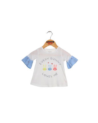 Flouncy Ruffles At The Sleeves, Every Bunny Printed, Crew Neck, 100% Cotton