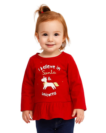Baby Girls, Long Sleeve, Crew Neck, Ruffle, Unicorn Santa Graphic, Soft, Casual, 100% Cotton