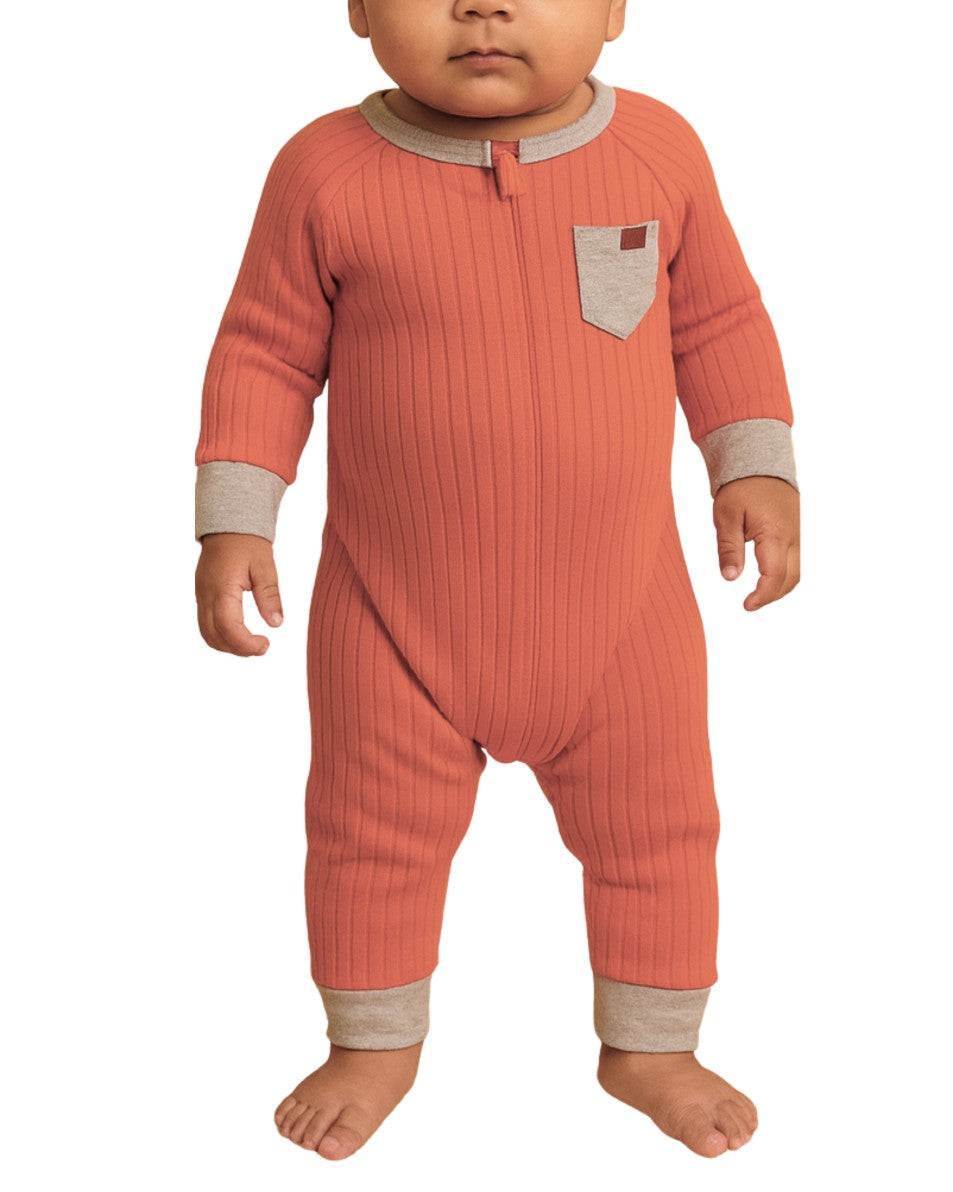 Baby Boys, Soft Jumpsuit, Long Sleeve, Crew Neck, Zipper Closure, Chest Pocket, Ribbed, Open Toe, 100% Cotton