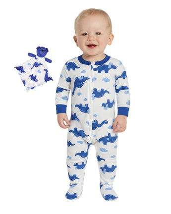Baby Boys, Long Sleeve, Crew Neck, Close Toe, Full Zipper, Comes With Matching Blankie, Allover Baby Dino Graphic, 95% Polyester, 5% Spandex