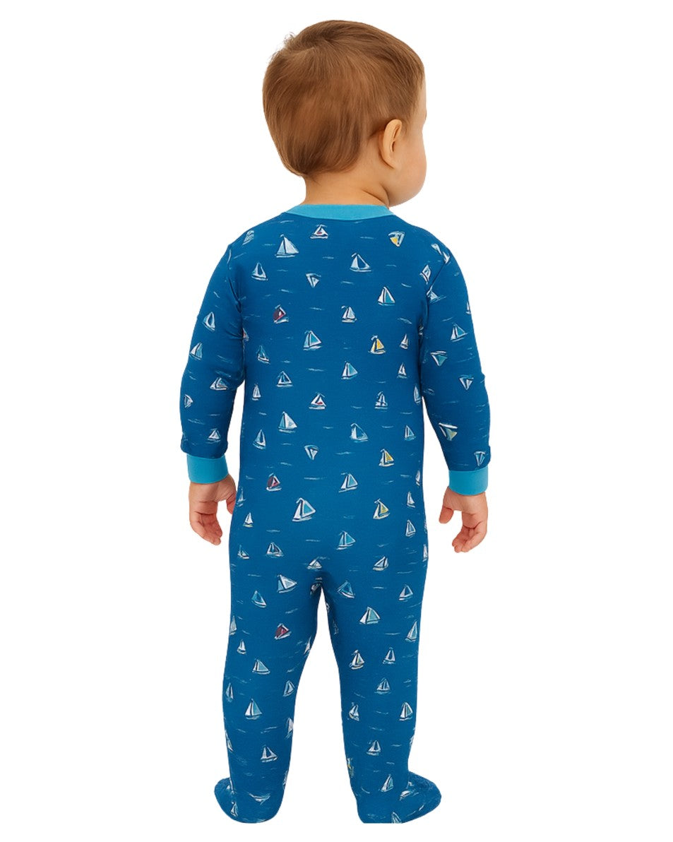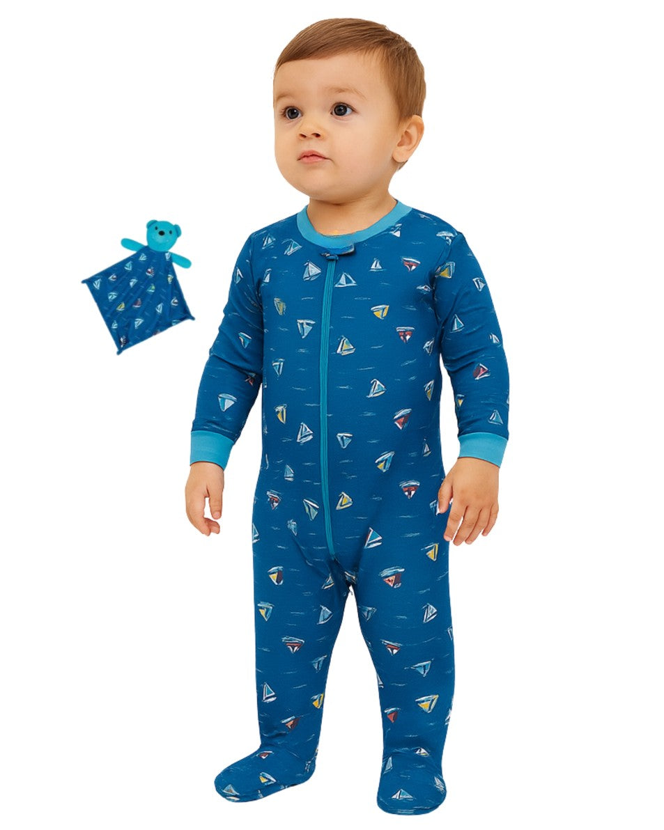 Baby Boys, Long Sleeve, Crew Neck, Close Toe, Full Zipper, Comes With Matching Blankie, Allover Sailboat Pattern, 95% Polyester, 5% Spandex