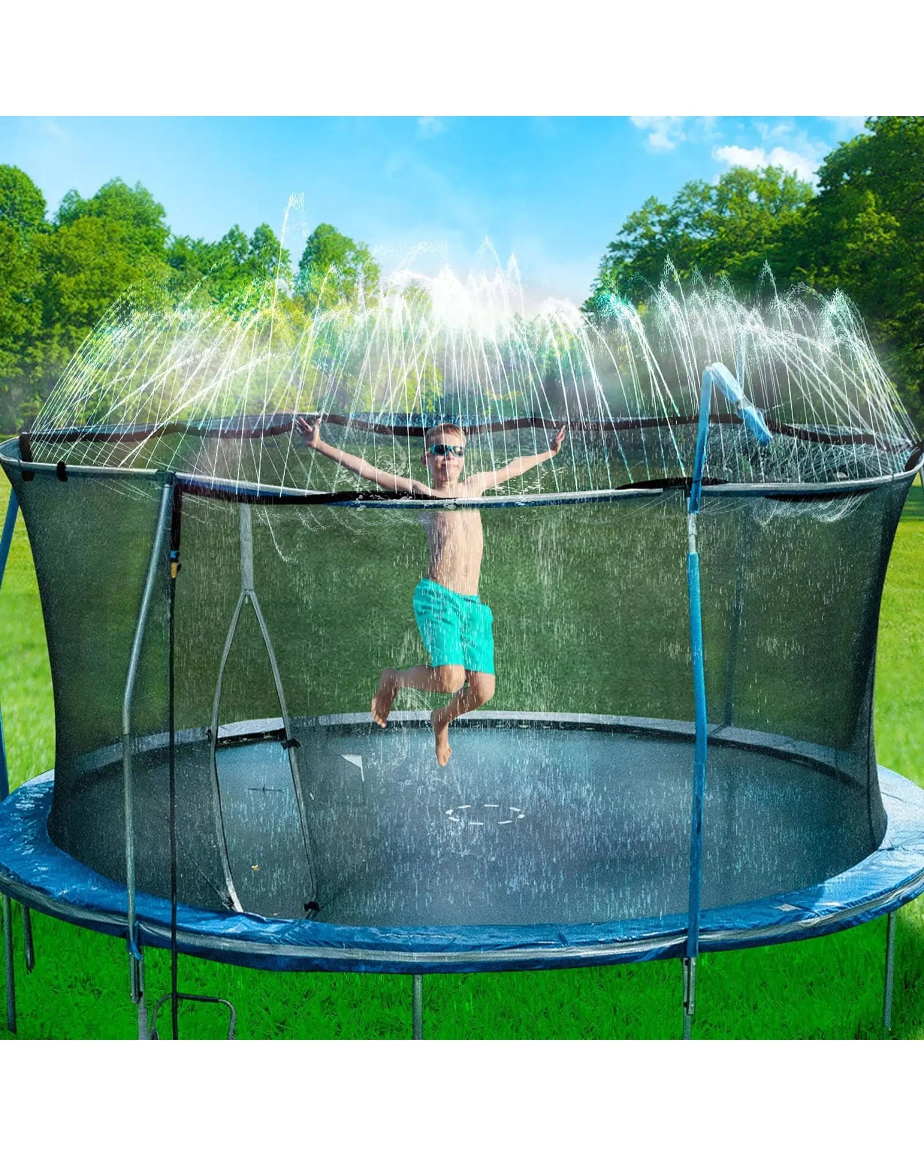 Funny Outdoor Trampoline Backyard Water Park Sprinkler Fun Summer Outdoor Water Toys for Boys Girls, It's Versatile and Can be Used in Various Settings, Providing a Fun Way to Cool Off During Hot Summer Days, The System is Designed for Easy Use and Adjustment of Water Flow