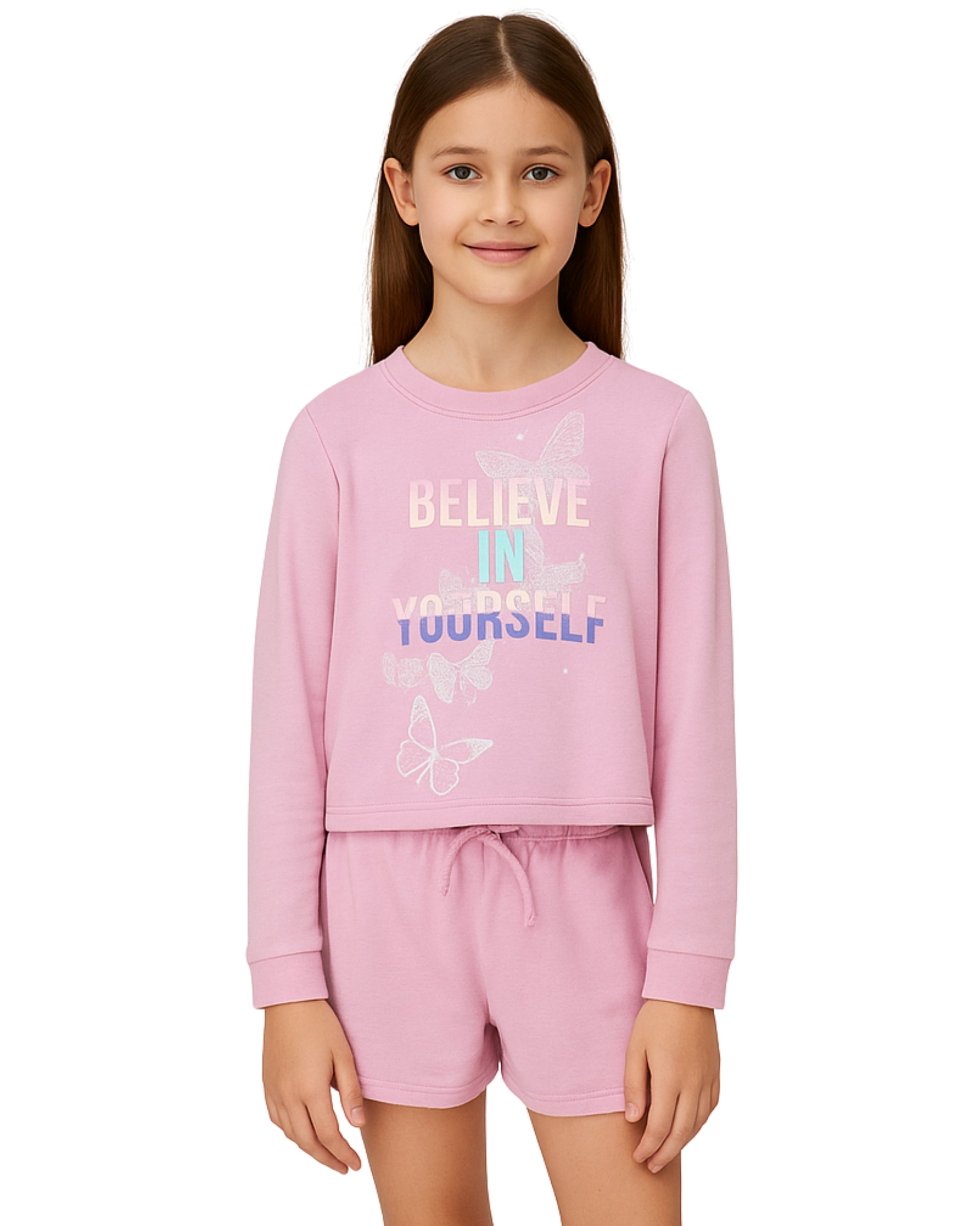 Kids, Girls, 2 Pcs, Crew Neck, Shorts, Long Sleeve, Graphics, Comfort, 95% Polyester, 5% Spandex