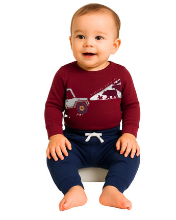 Baby Boys, Durable Set, Long Sleeve Jumpsuit , Crew Neck, Snap Button, Stretch Waistband With A Drawsting Pant, Comfort, Front Graphic, 100% Cotton