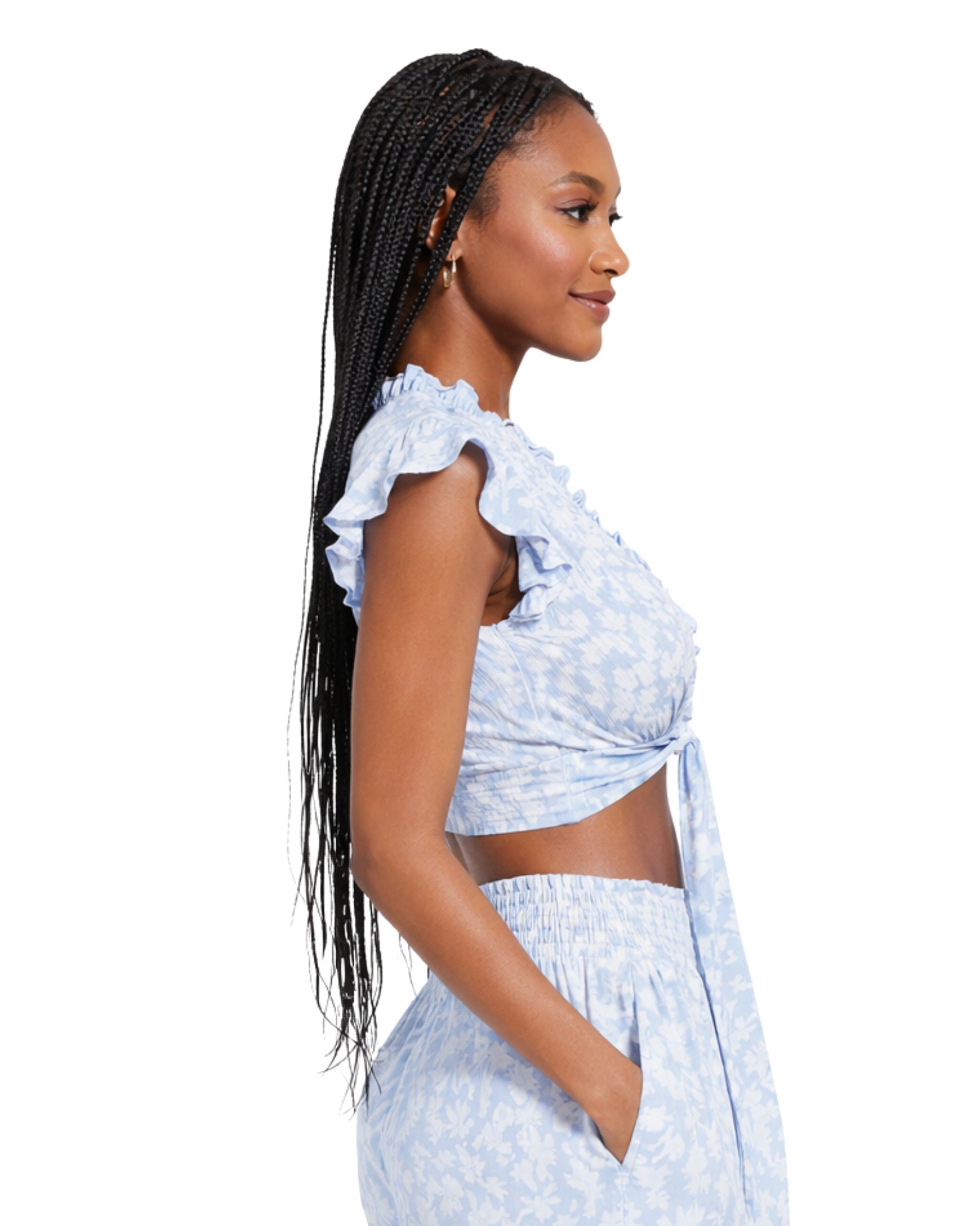 Flutter Sleeve, V Neck, Rubber Bow, Printed, Cropped, Casual, 95% Polyetser, 5% Spandex
