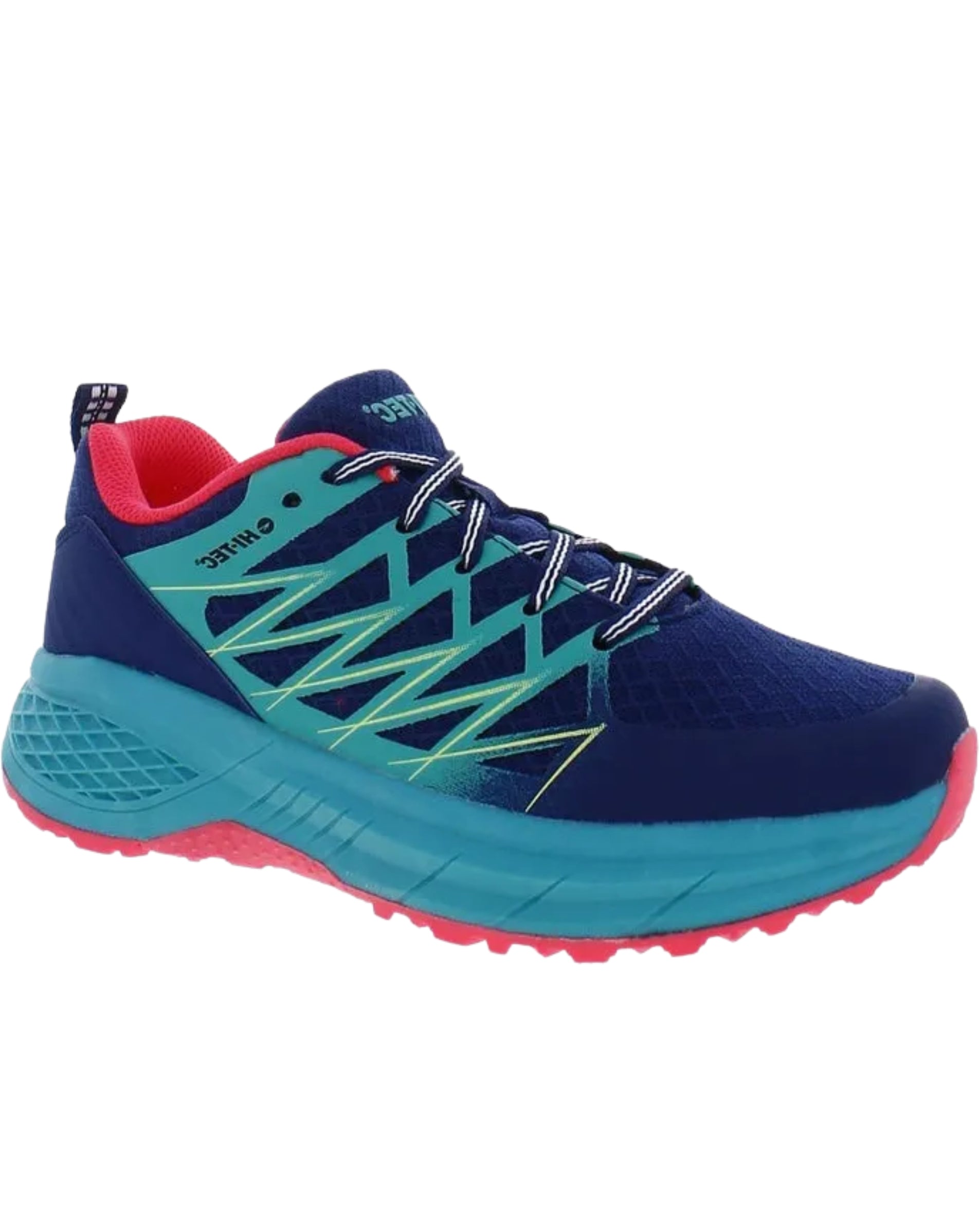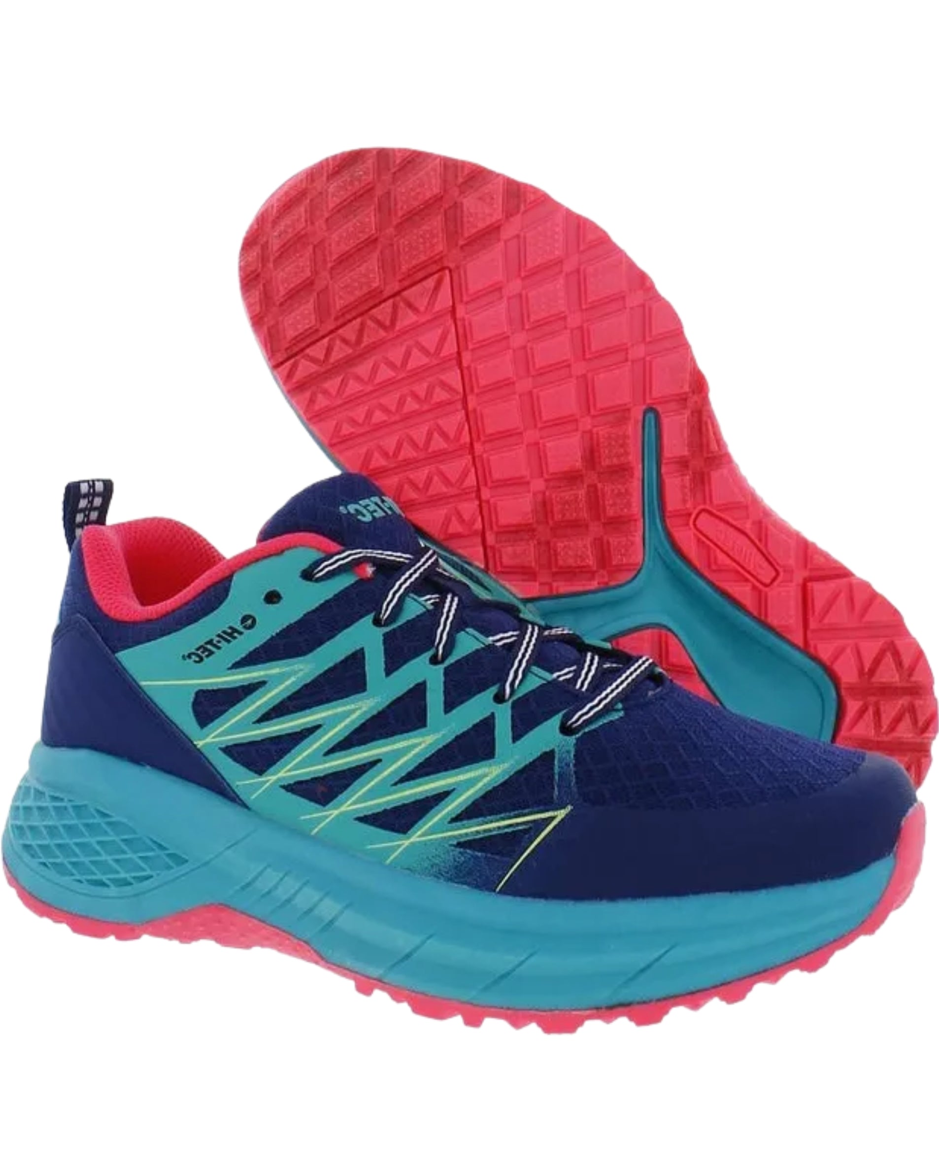 Women, reathable mesh with synthetic zig-zag overlays, Bright pink padded collar for comfort, Thick cushioned teal midsole for impact absorption