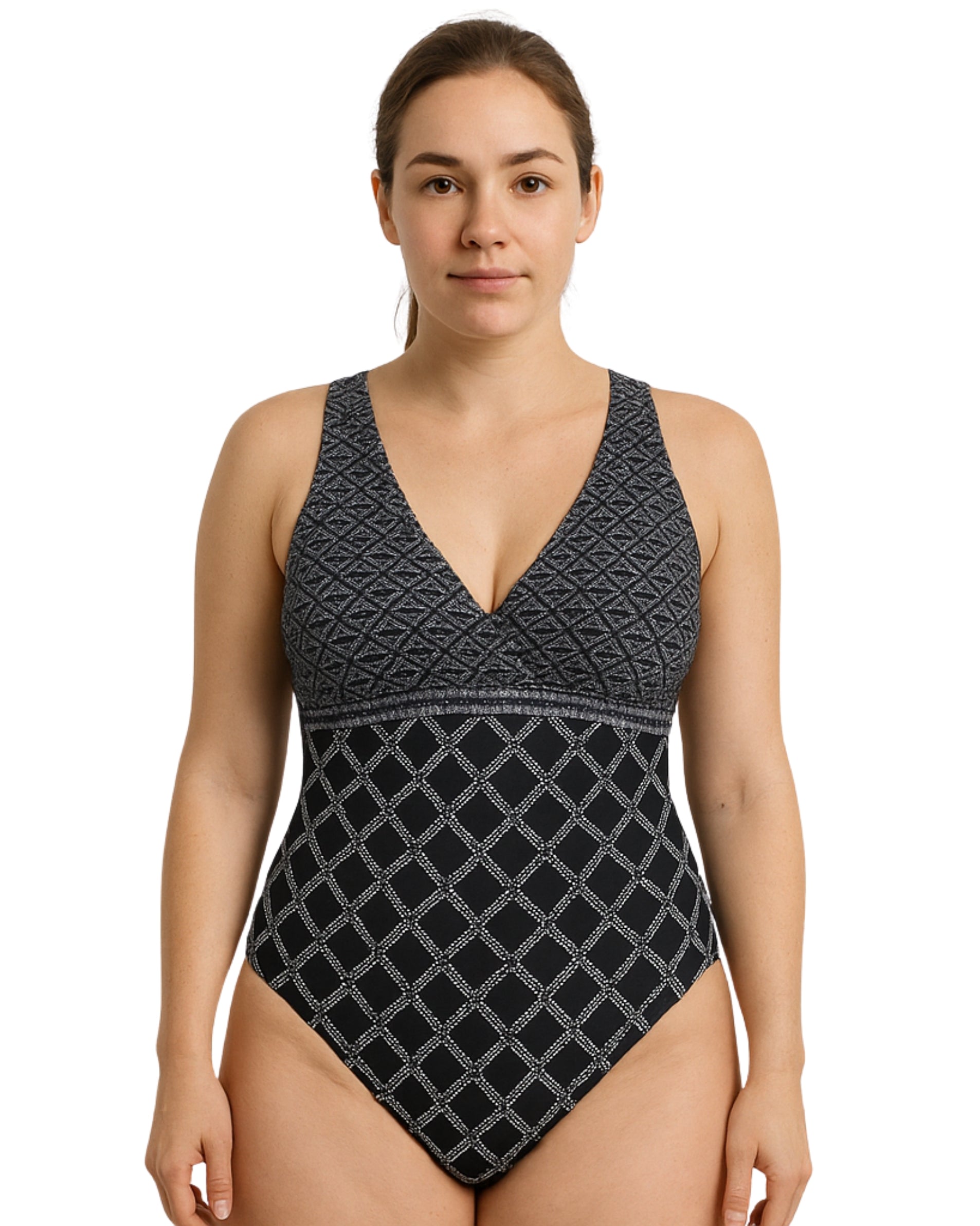 V Neck, Sleeveless, Printed, Open Back, 82% Nylon, 18% Spandex