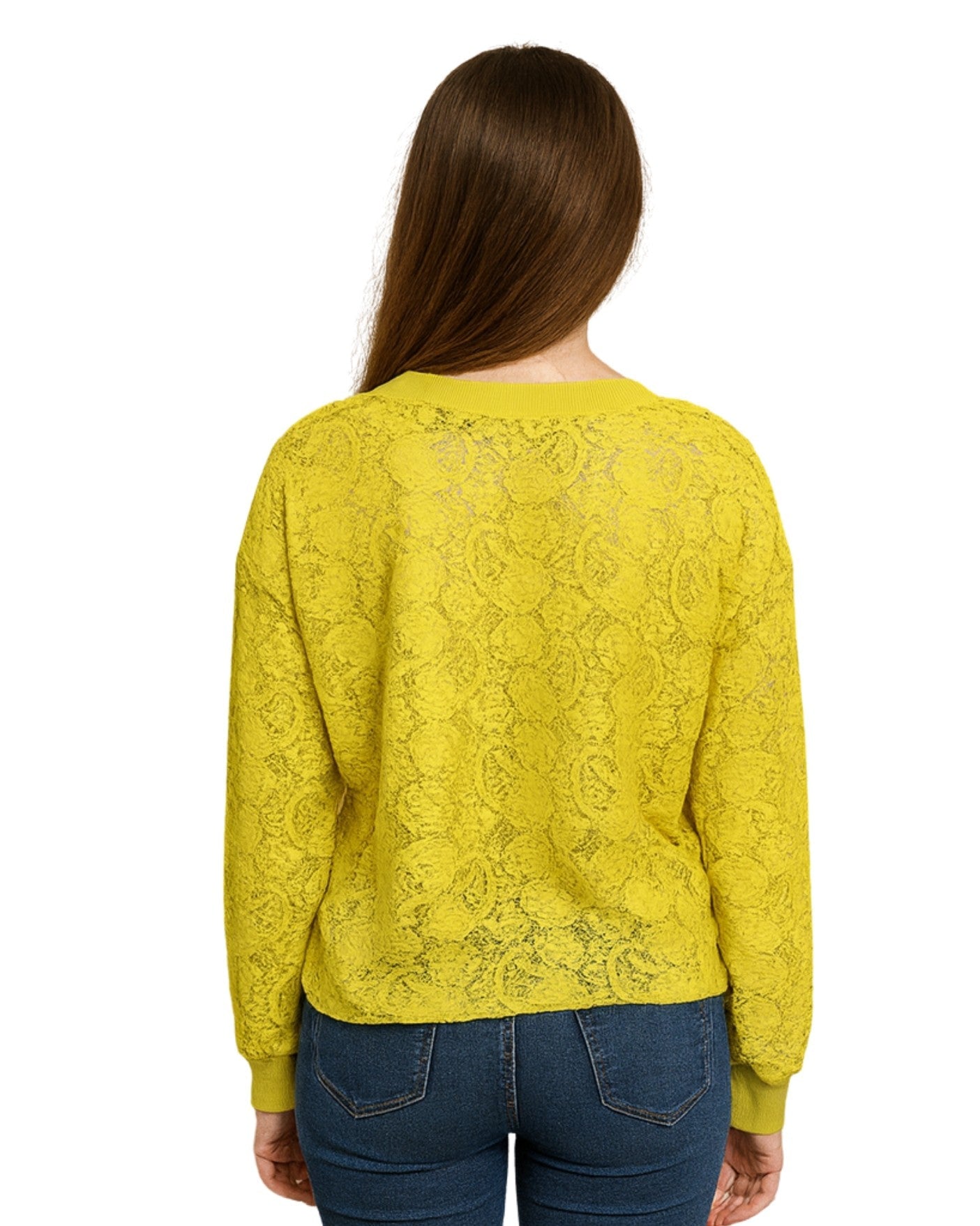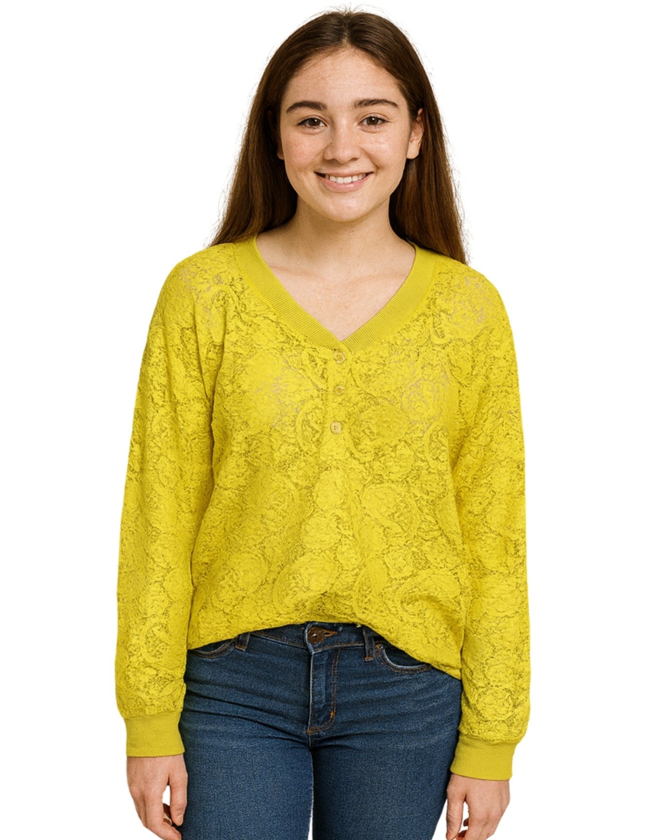 Girls, Long Sleeve, Round Neck, Front Button Closure, Floral Lace Trim, Stretch, Fit, Casual, 88% Nylon, 12% Spandex