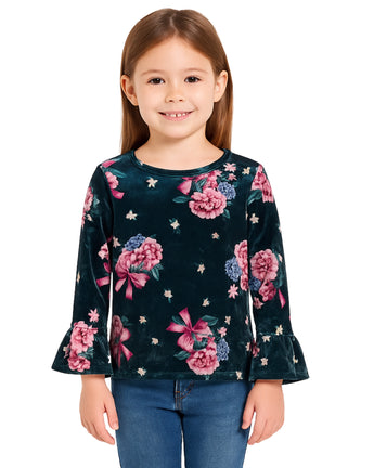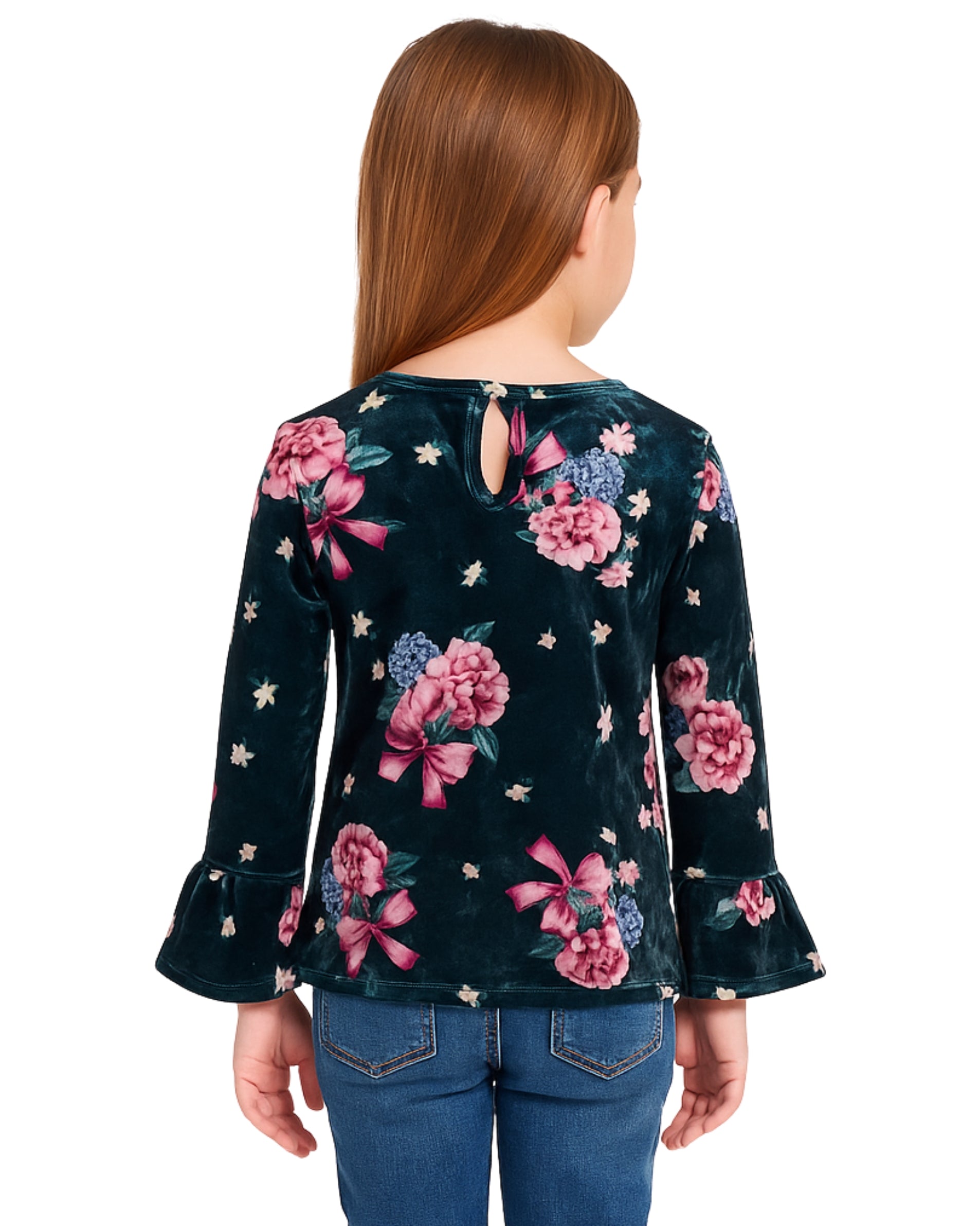 Girls, Long Sleeve, Crew Neck, Ruffled Cufs, Floral, Soft, Relaxed, Warm, Casual, 93% Polyester, 3% Elastane