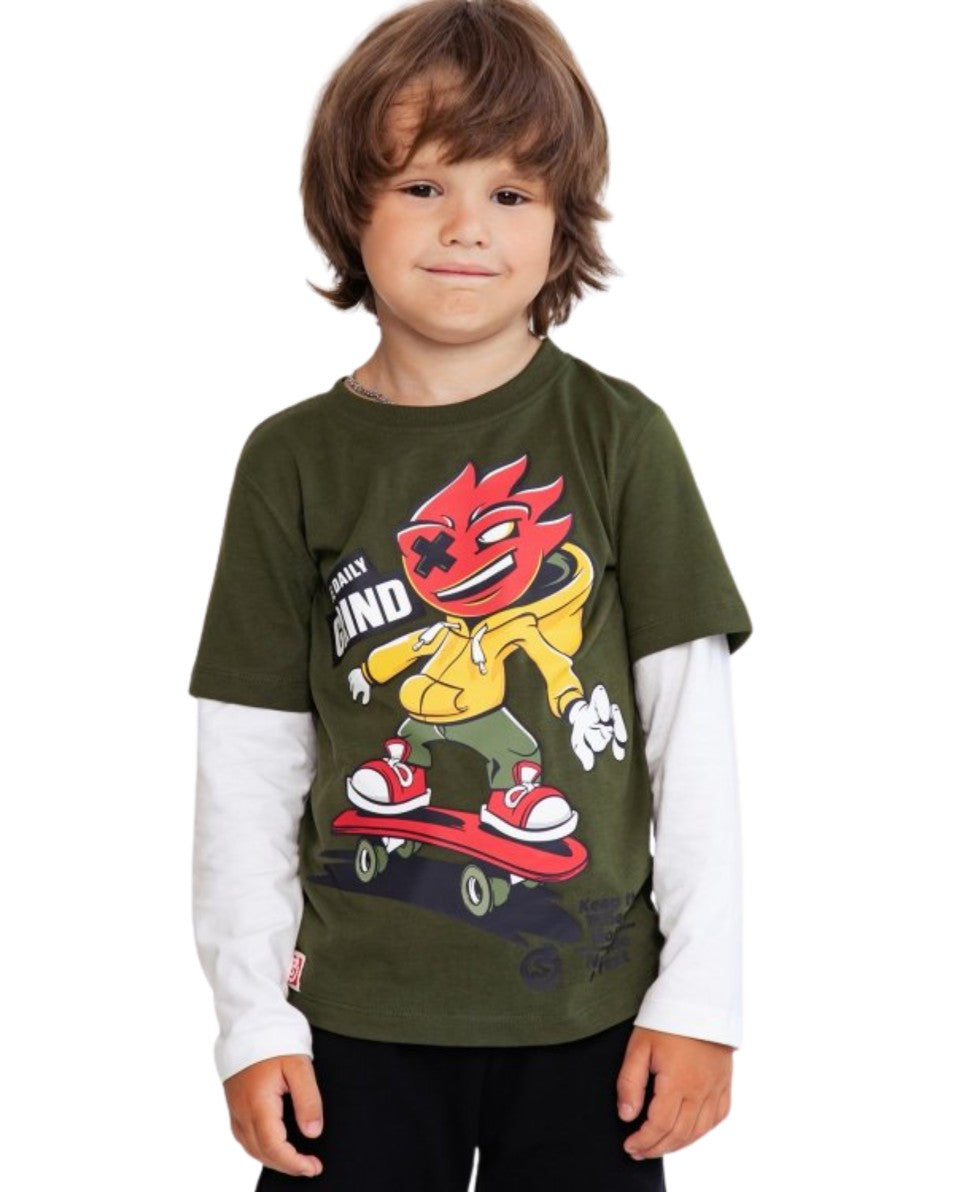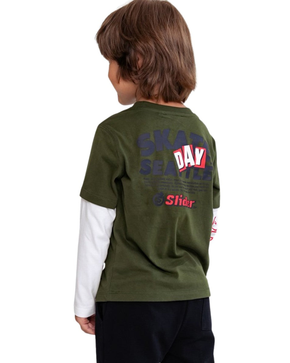 Boys, Long Sleeve, Crew Neck, Vibrant Skater Graphic, Layered Style Designed with White Long Sleeve Sewn into the Short Sleeve Olive Green Tee, Soft & Durable Cotton, 100% Cotton