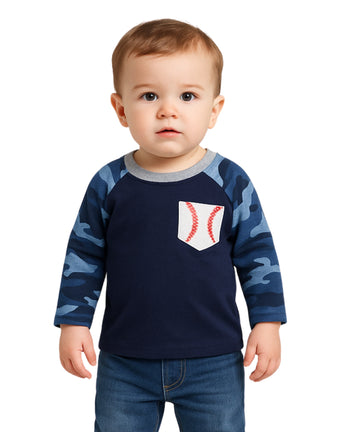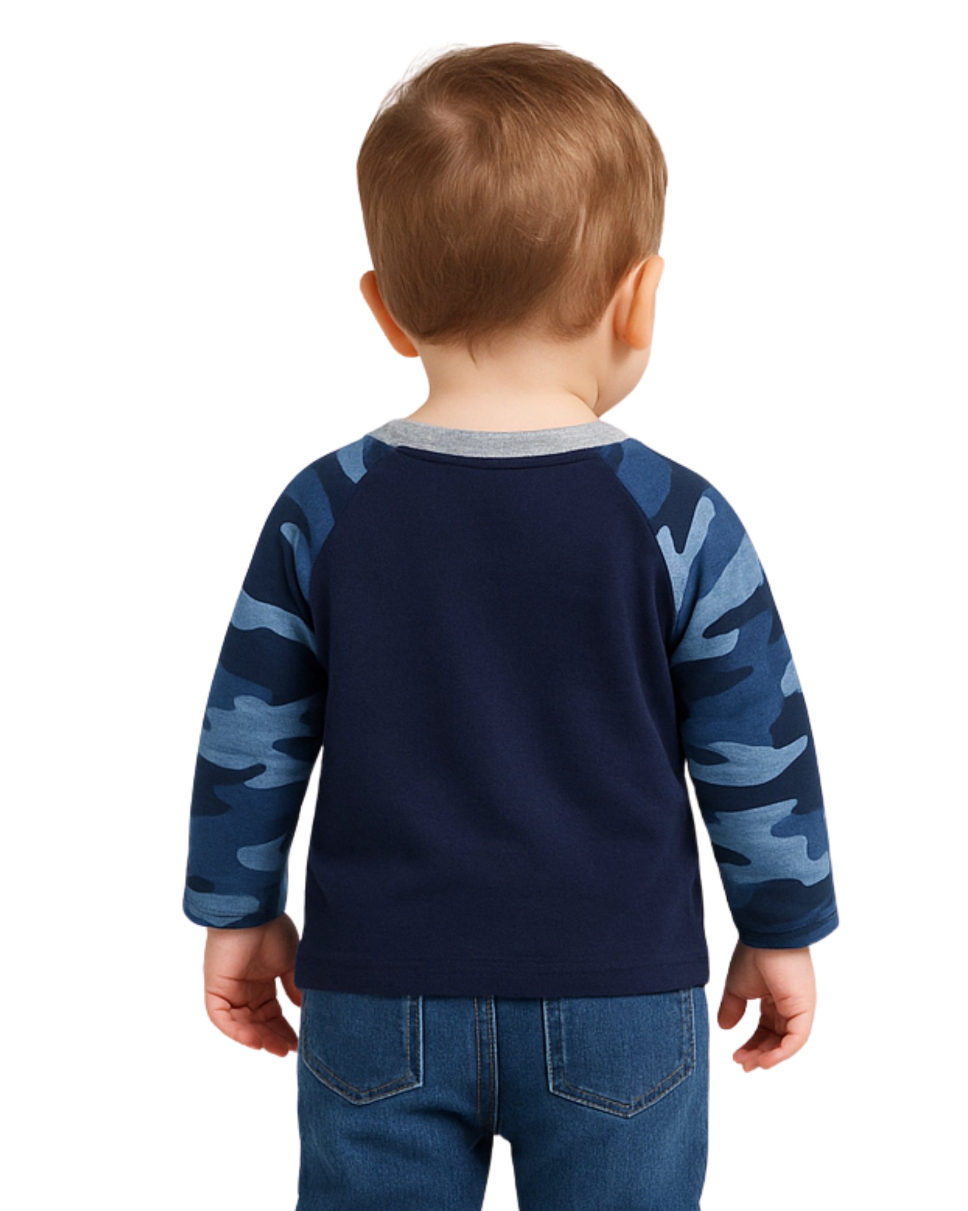 Baby Boys, Long Sleeve, Crew Neck, Chest Pocket, Camo Sleeve, Soft, Casual, 100% Cotton