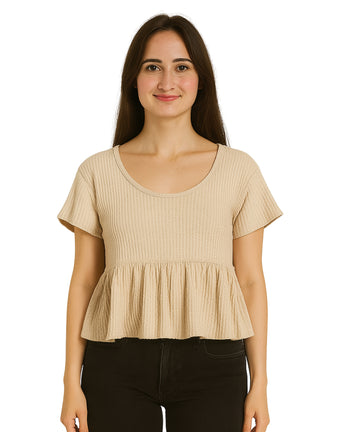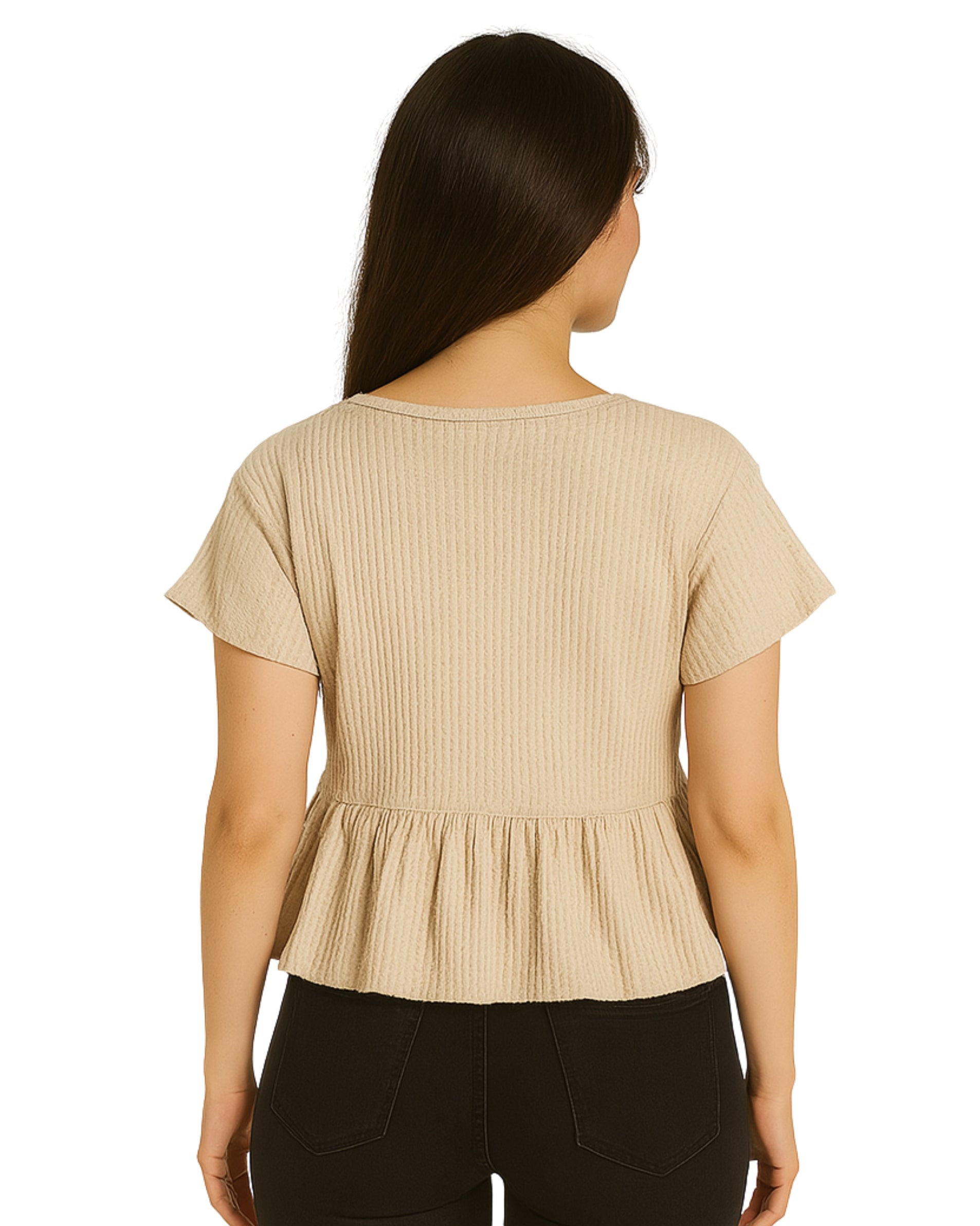 Ruffle, Split Neck, Short Sleeve, 97% Polyester, 3% Spandex