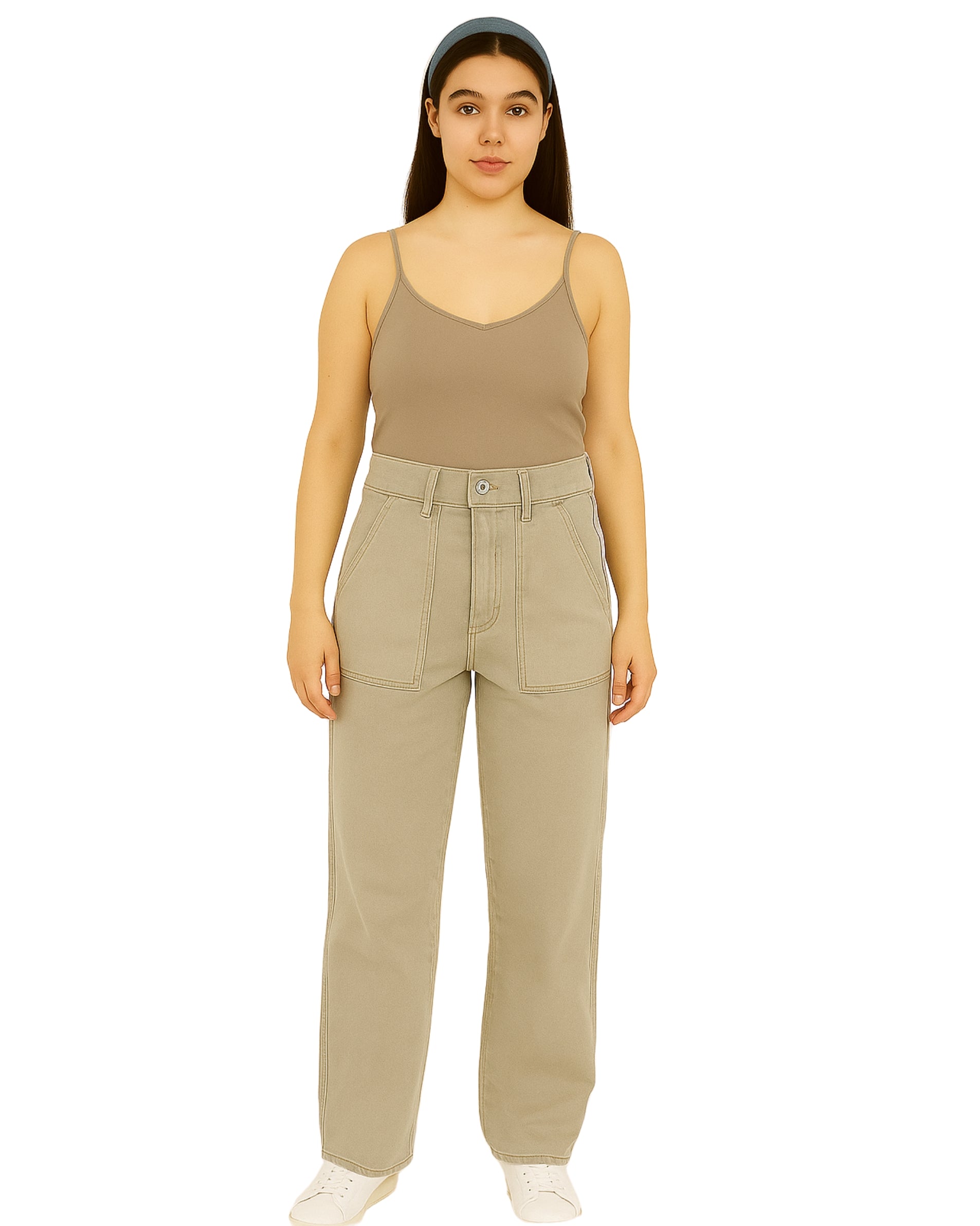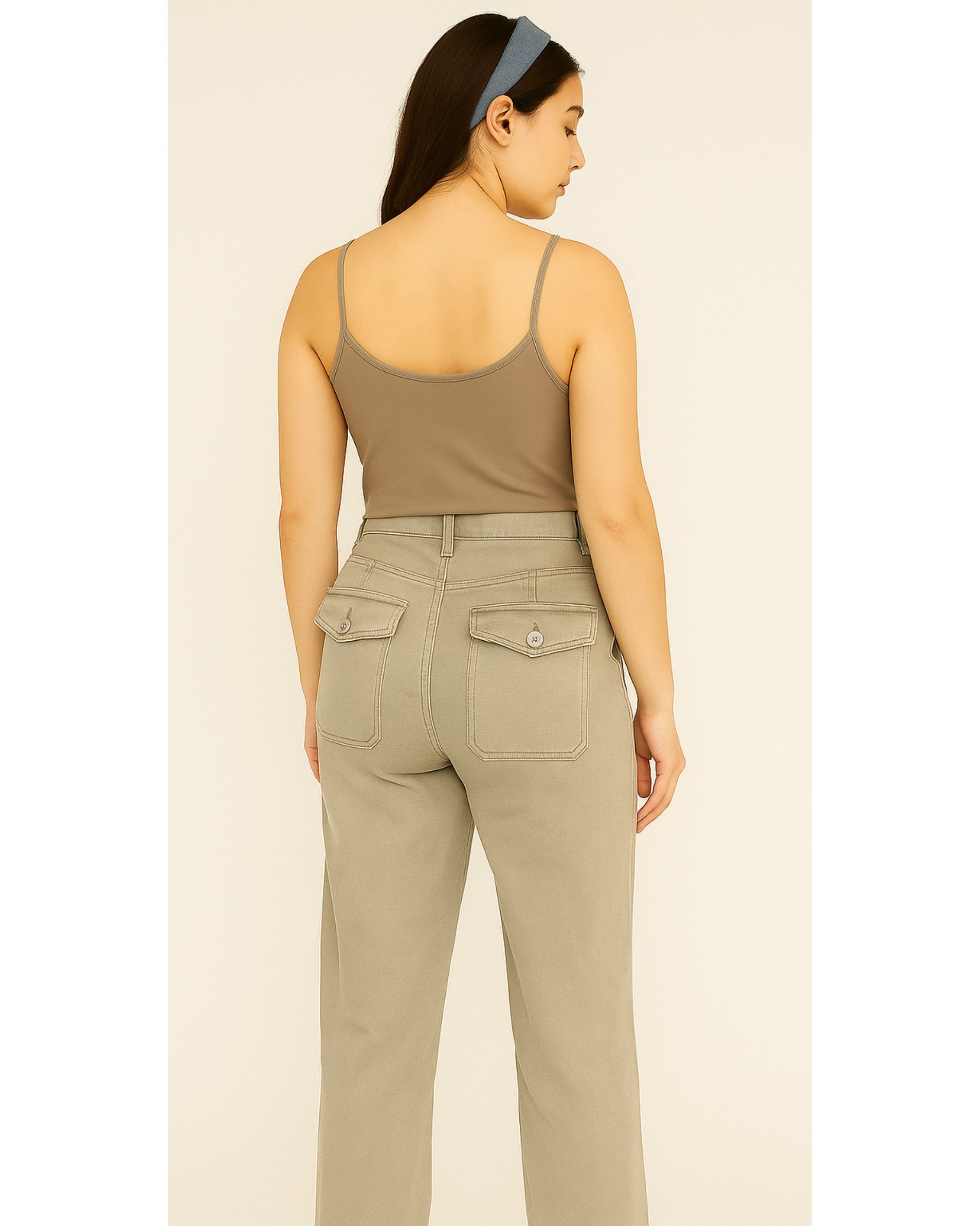 Women, Pant Cargo, Pockets, Button, Zipper Closure, Streitch, Regular, Super High Rise, Stylish