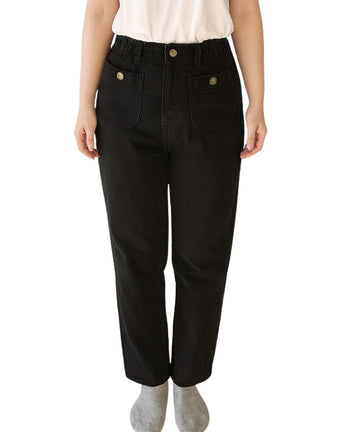 Women, Pull On, Stretch Waistband, Button With Zipper Closure, High Rise, 2 Pockets, 2 Back Pocket, Bold Gold Tone Button Details, Tapered Leg, Relaxed, Casual, 100% Cotton